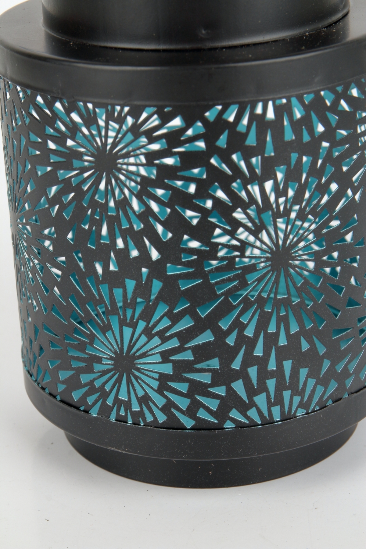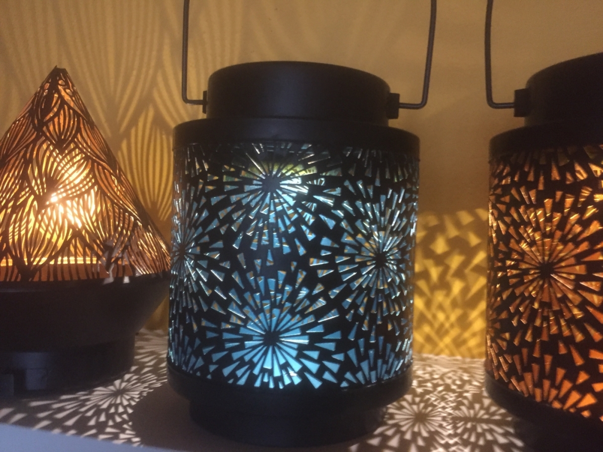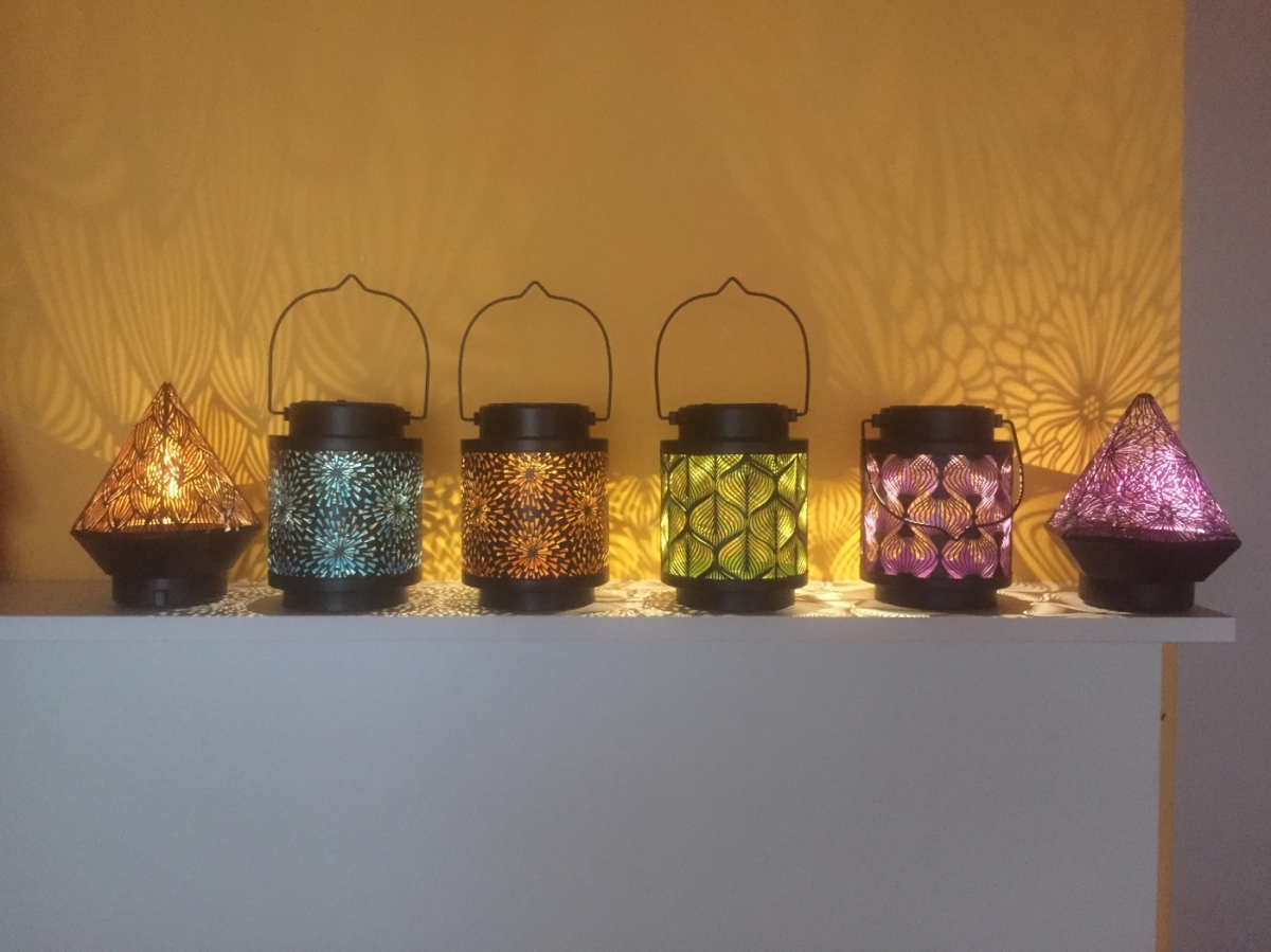 Solární lucerna venkovní s perforovaným kovovým pláštěm, který na stěnách odráží ornamenty z osvětlení solární lucerny.