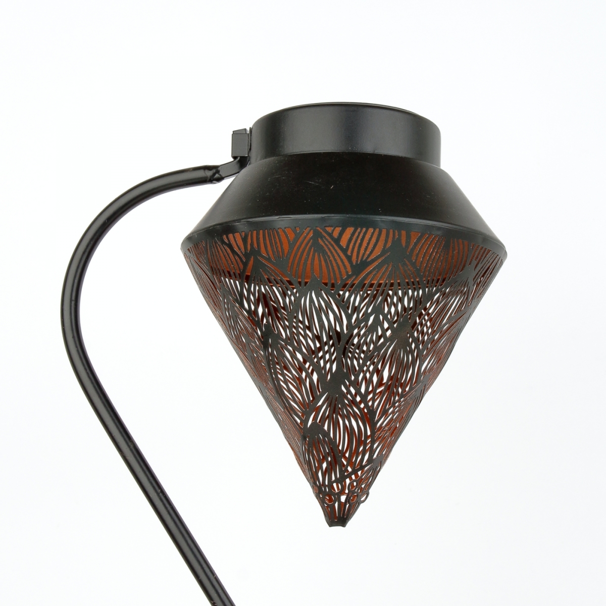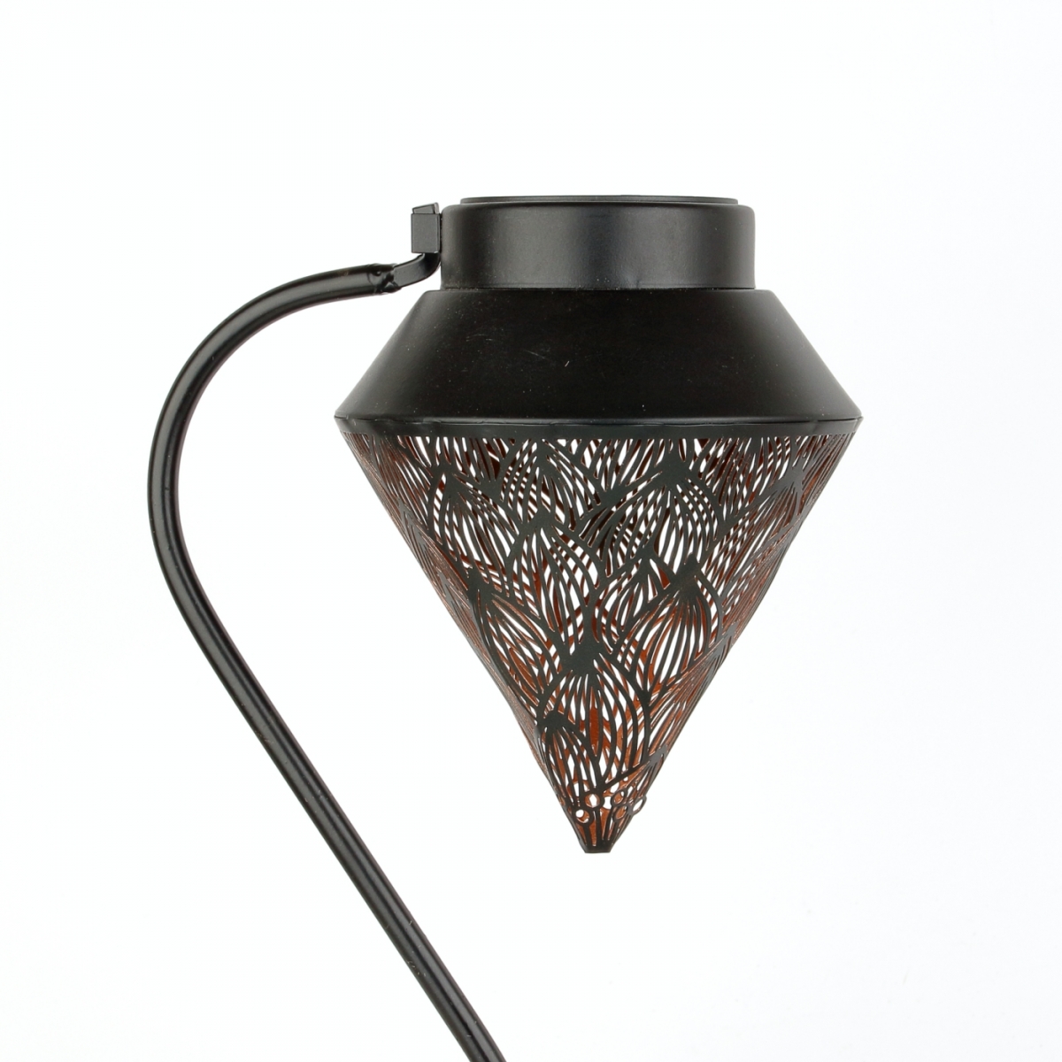 Solární zahradní lucerna se zápichem, s perforovaným kovovým pláštěm s ornamenty.