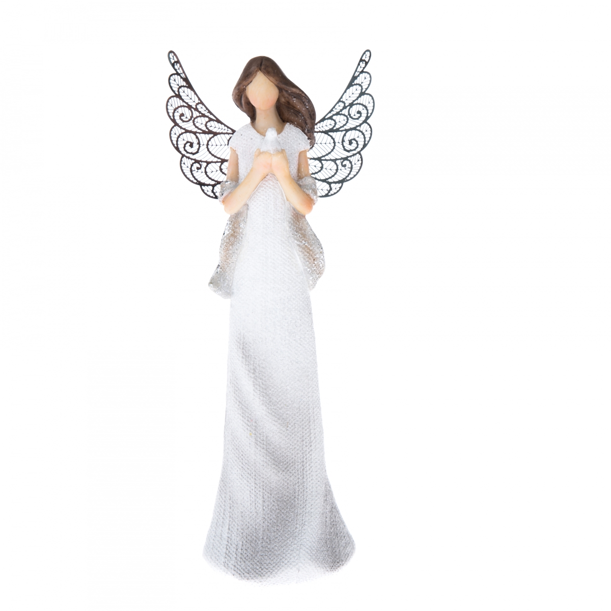 Soška anděla v bílých šatech se třpytivým posypem a něžnými kovovými křídly bude krásný svatební dar pro novomanžele.