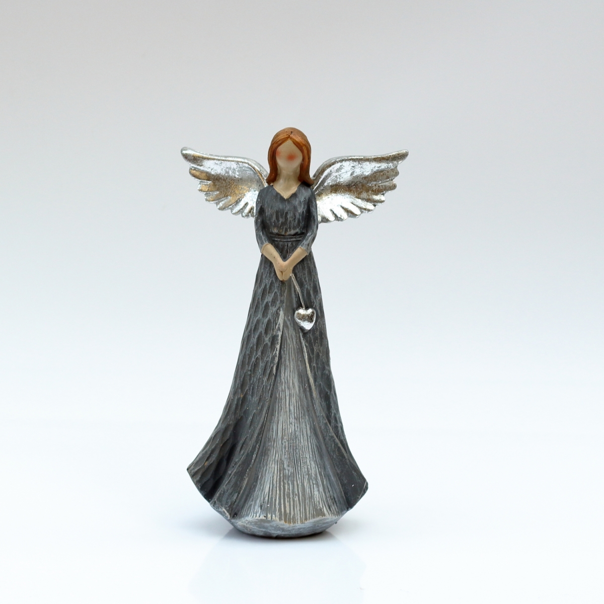 Soška anděla v šedých šatech se srdcem znázorňující Lásku