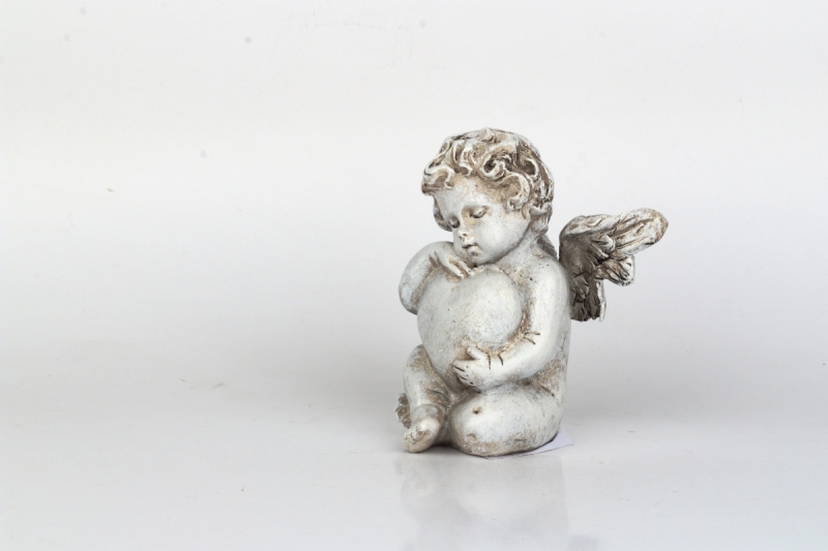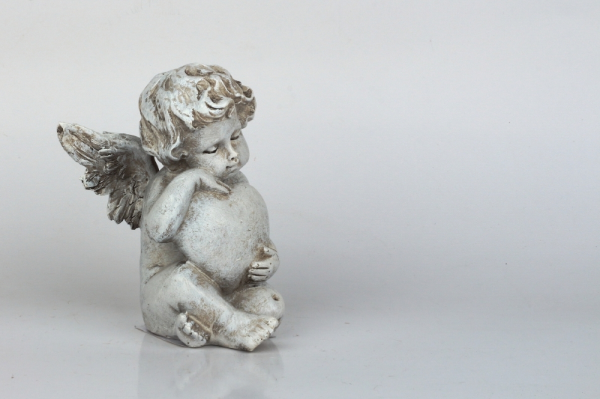 Soška anděla ztvárňující něžnou postavu se svírajícím srdcem v klíně.