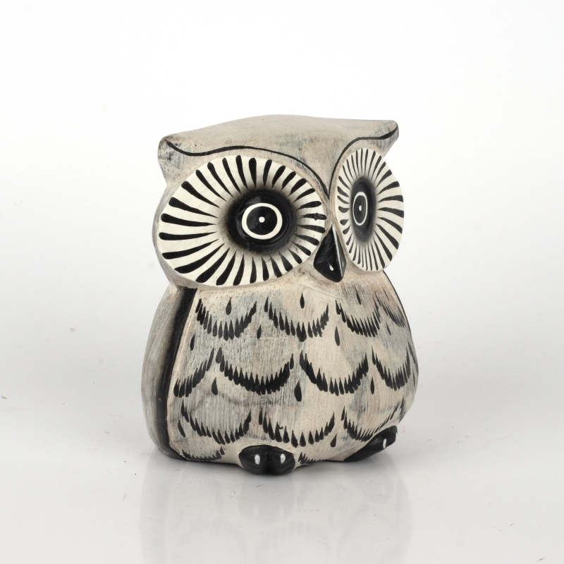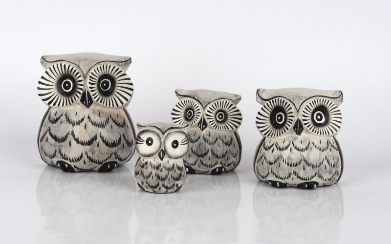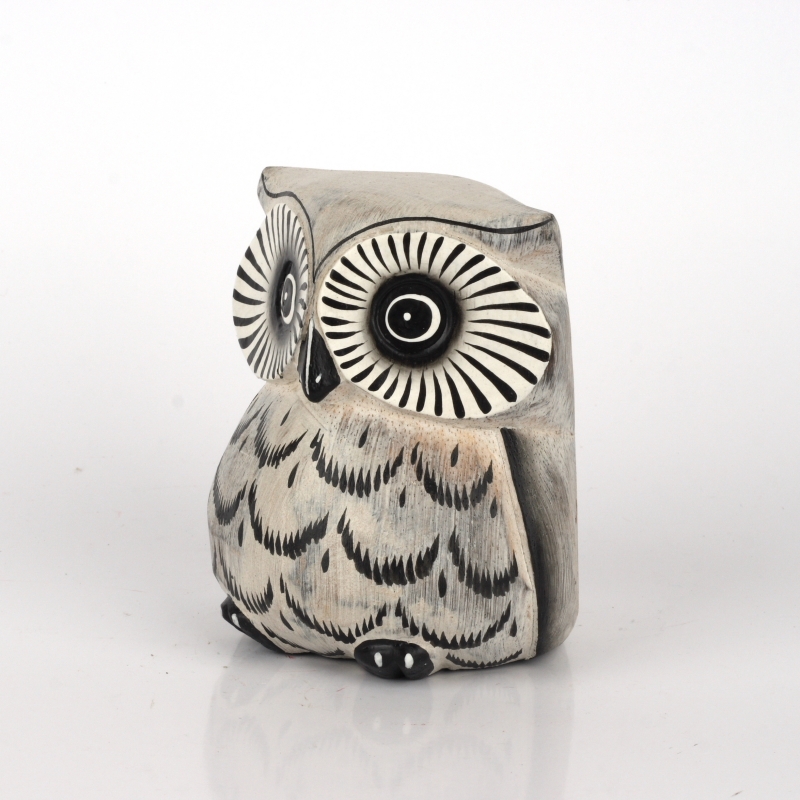 Dřevěná soška bílé sovy je dostupná ve více velikostech.