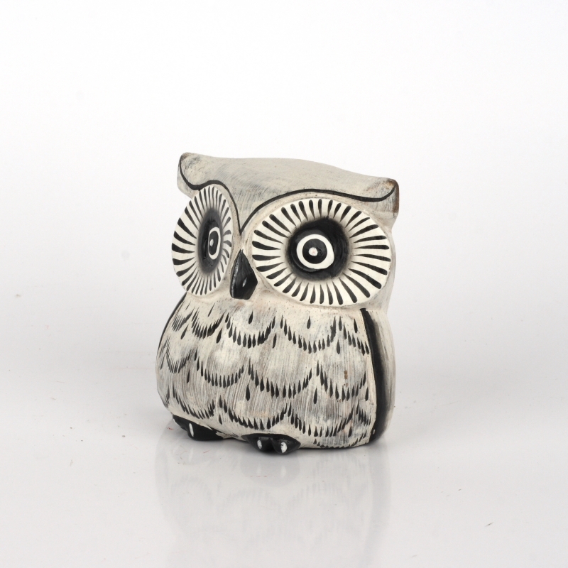 Dřevěná soška bílé sovy je dostupná ve více velikostech.