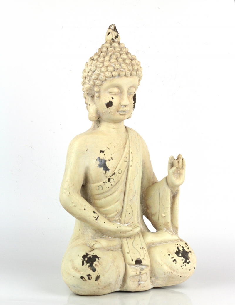Krásná soška Buddhy má netypickou krémovou glazuru s oprýskaným vzhledem.