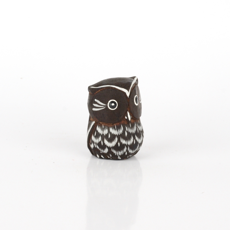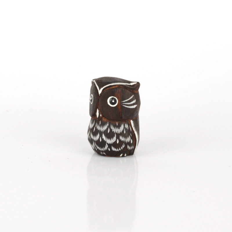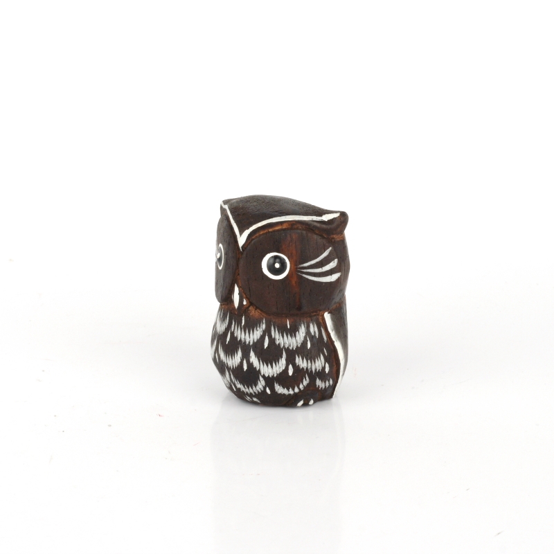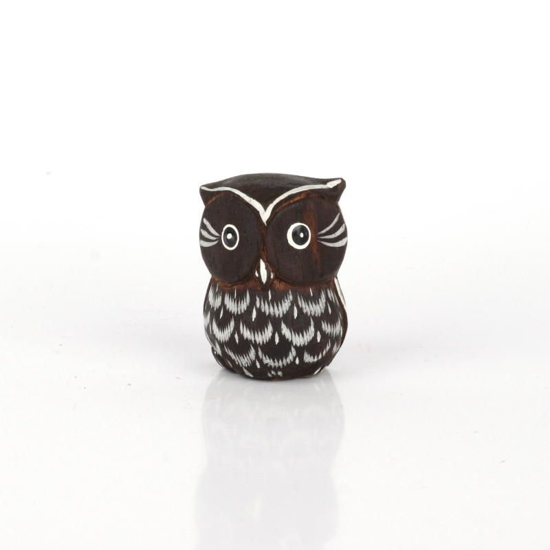 Soška dřevěná sova tmavě hnědá 6cm pro milovníky drobných bytových dekorací.
