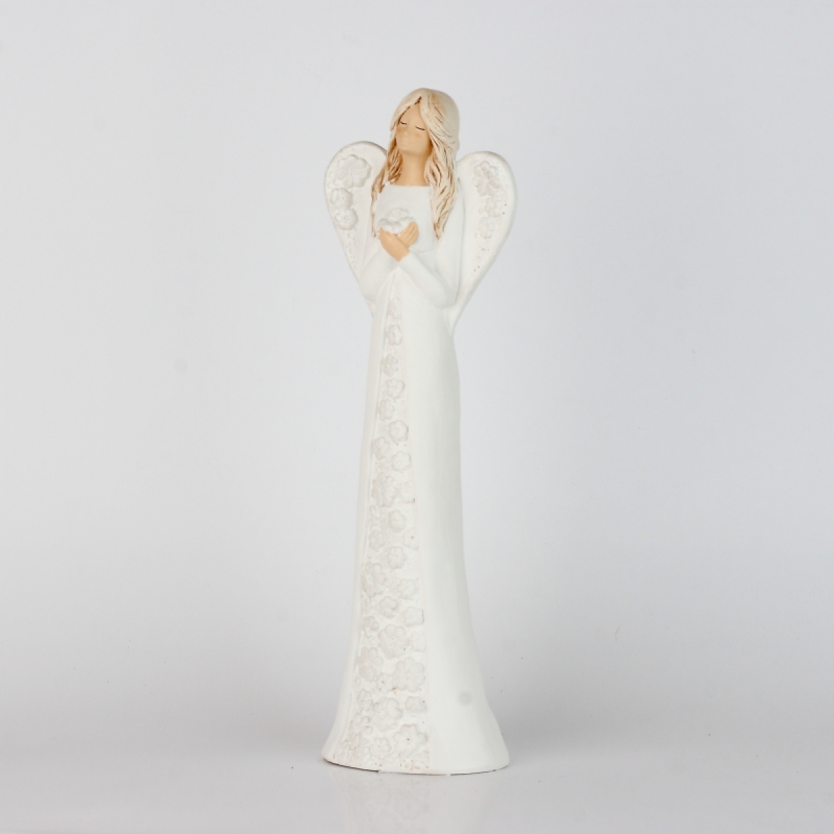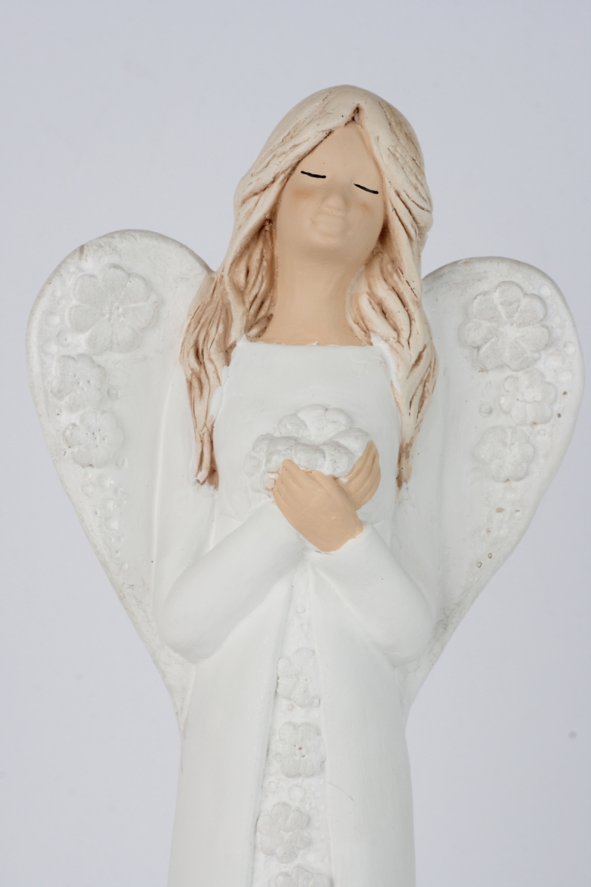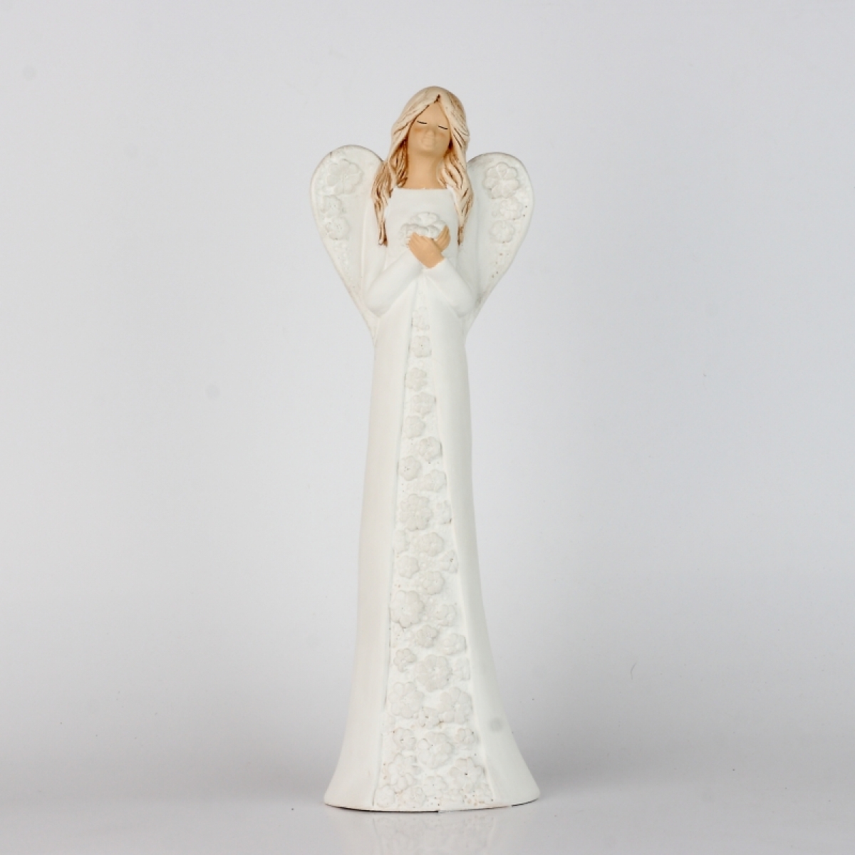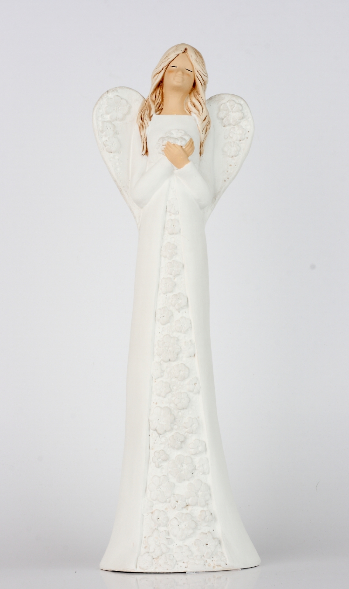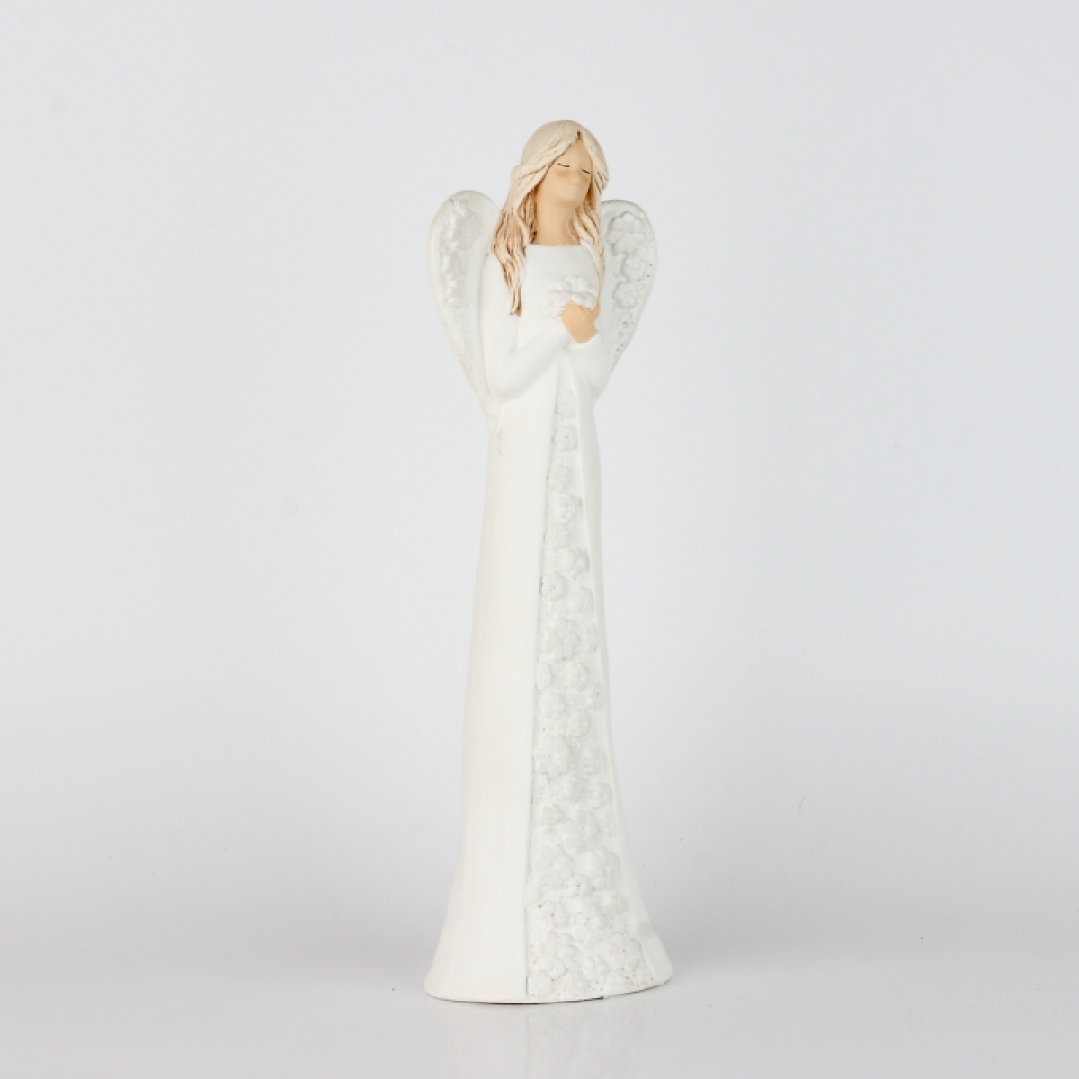 Soška sádrového anděla s bílými květovanými šaty 37cm