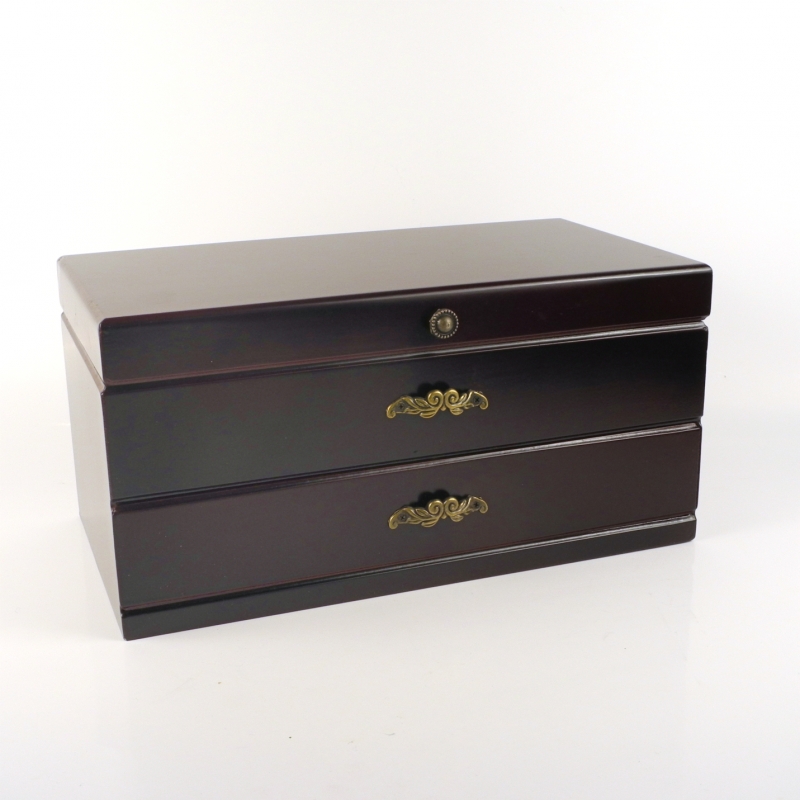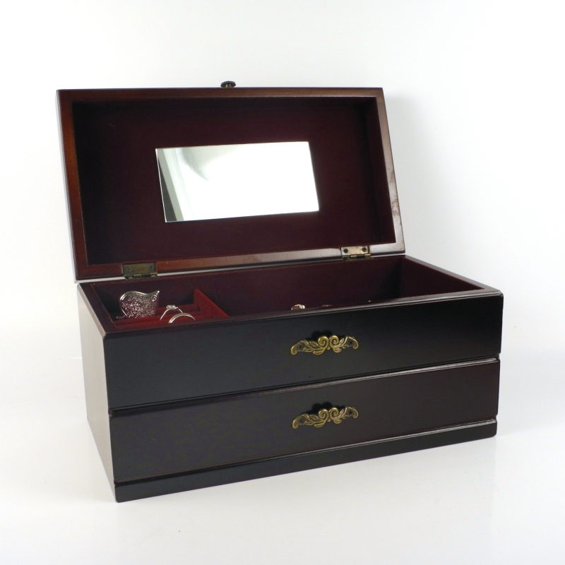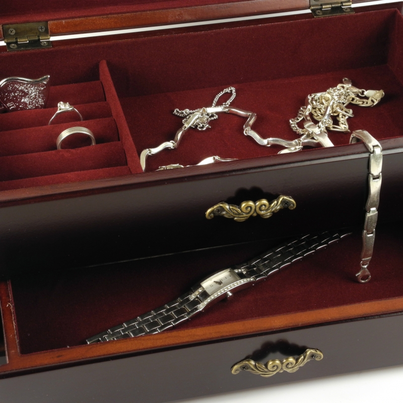 Šperkovnice na obrázku má rozměr 28 x 15 x 14 cm. Její přední stranu zdobí zajímavé kování. Je dosti velká, aby se do ní vešly všechny cenné poklady její majitelky. Šperkovnice je dřevěná, na její výrobu byl použitý i plast. Aby byly šperky jako ve vatičce, je vypolstrovaná jemným semišem v hnědočervené barvě. Na spodní straně víka najdete i zrcátko, takže si můžete zkontrolovat, jak vám šperky sluší. Tato elegantní šperkovnice je ideálním dárkem pro každou ženu a neudělá ostudu v žádném interiéru.