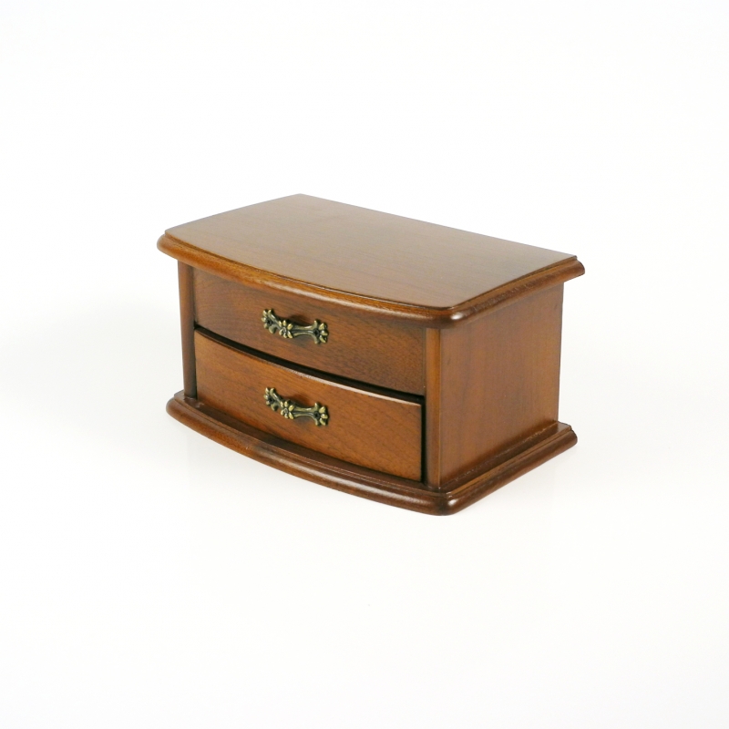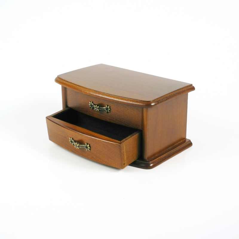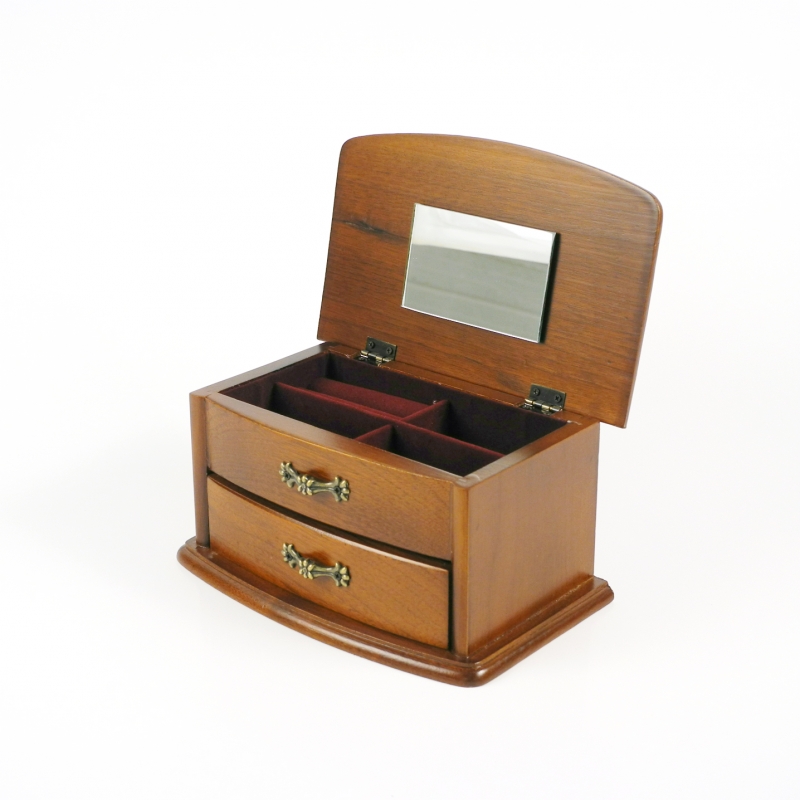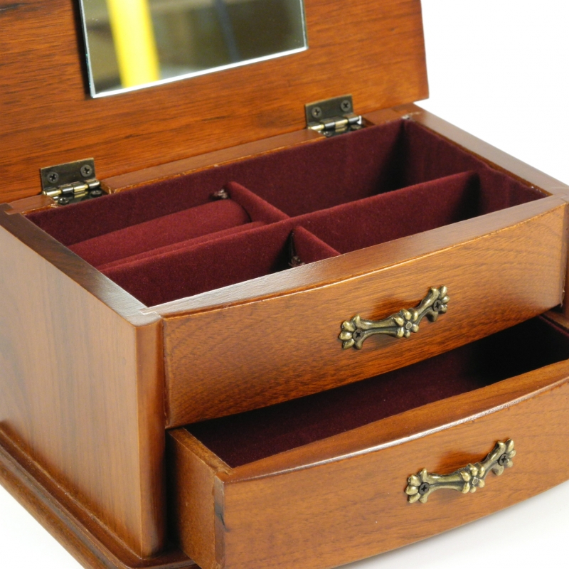 Šperkovnice na obrázku je vyrobená ze dřeva světlé barvy. Její celkové vnější rozměry jsou 18 x 12 x 9 cm. Šperkovnice má své úložné prostory vypodložené hebkým sametem. Žádná majitelka se tedy nemusí bát, že se její skvosty odřou nebo poničí. Uvnitř najdete mnoho praktických přihrádek, na spodní straně víka je přilepené zrcátko. Šperkovnice má zaoblené hrany a je velmi elegantní. I úchytky jsou vkusně zdobeny kytičkou a pěkně tak doplňují vzhled celého výrobku.