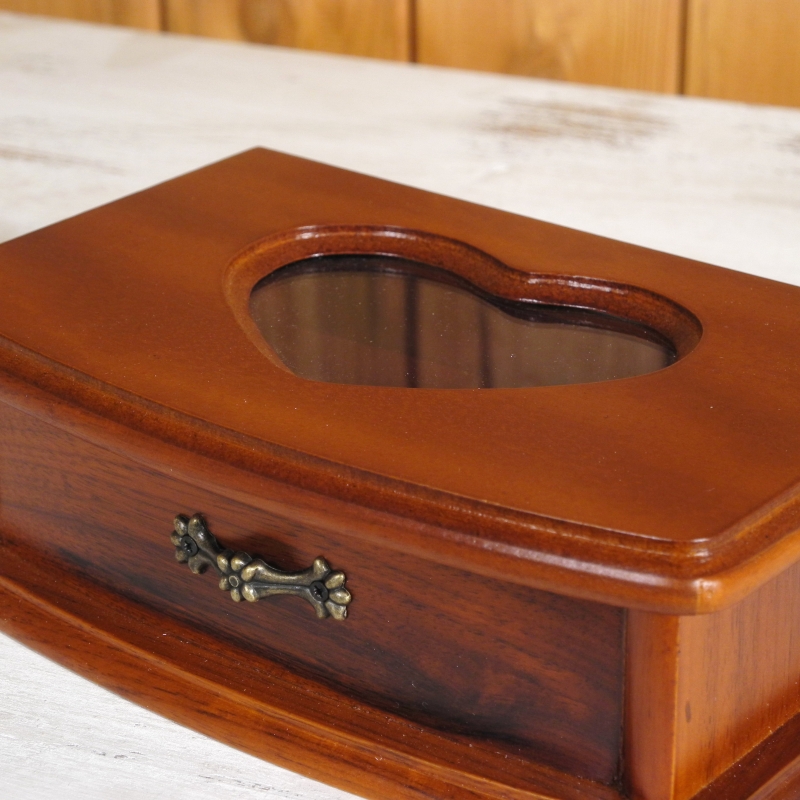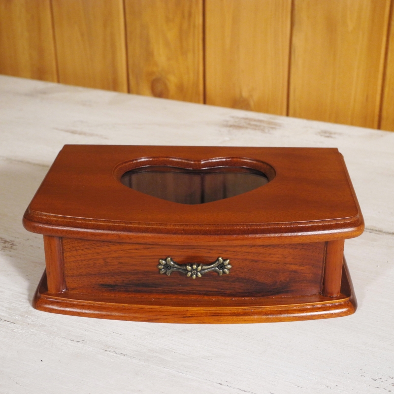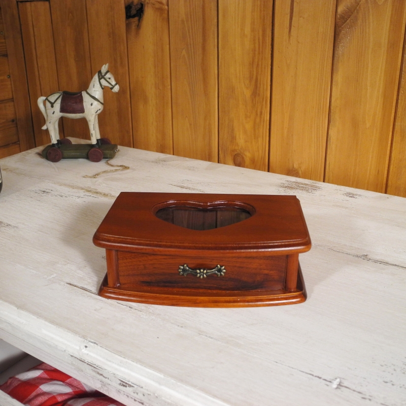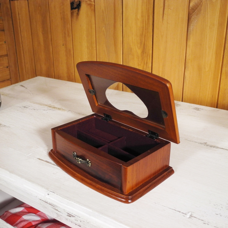 Šperkovnice, kterou vidíte na obrázku, vás jistě nejvíce zaujme svým zdobným prvkem na víku. V dřevěném víku je zasklený otvor ve tvaru srdce. Tím můžete nahlédnout do útrob šperkovnice, aniž ji otevřete. Rozměry šperkovnice nádherného zaobleného tvaru jsou 19 x 12 x 6 cm. Chcete potěšit dámu svého srdce? S touto šperkovnicí se vám to jistě podaří.