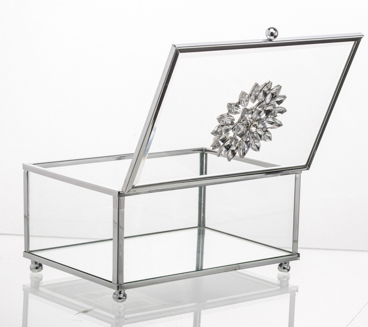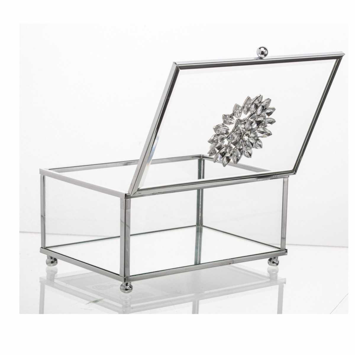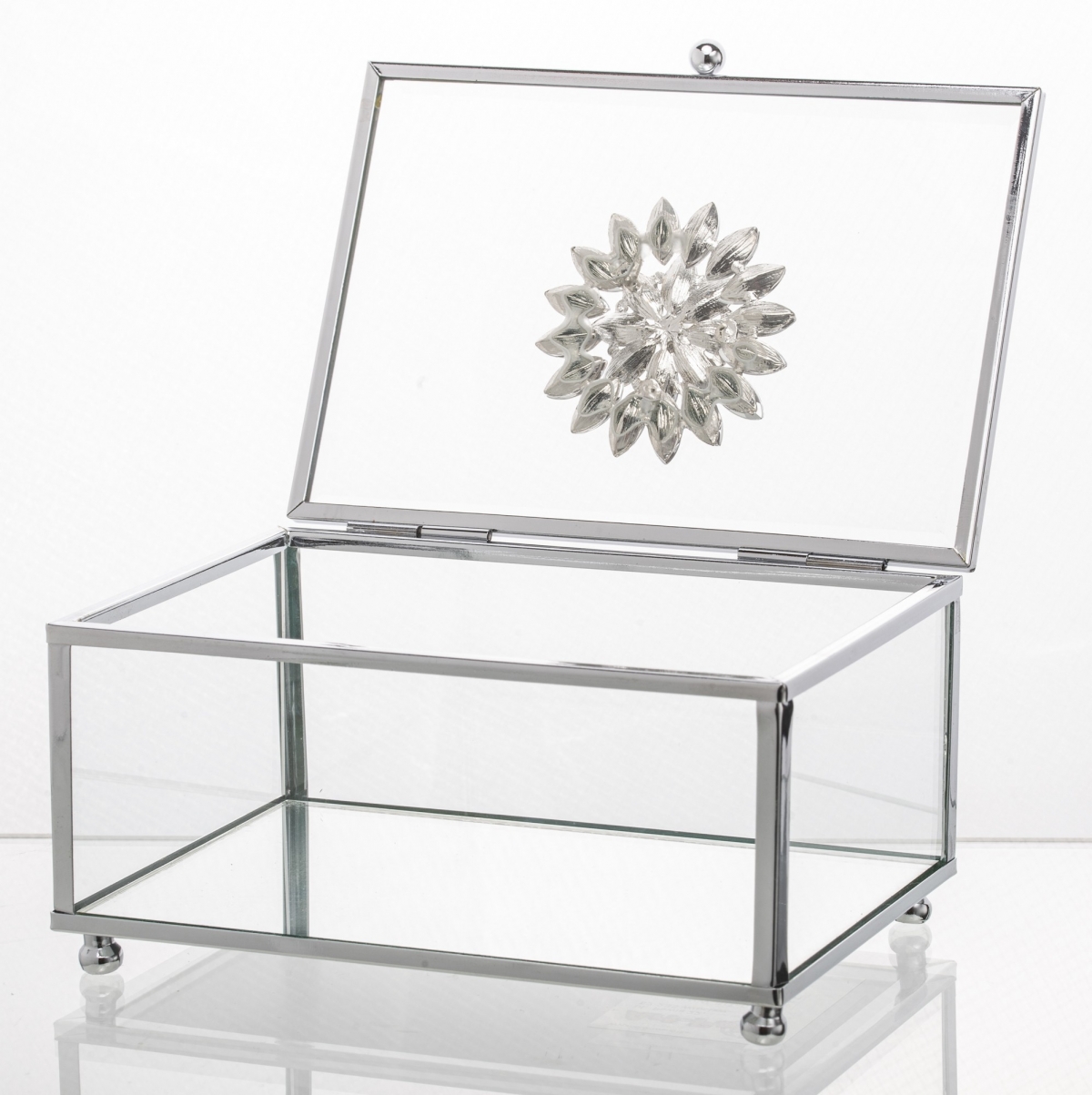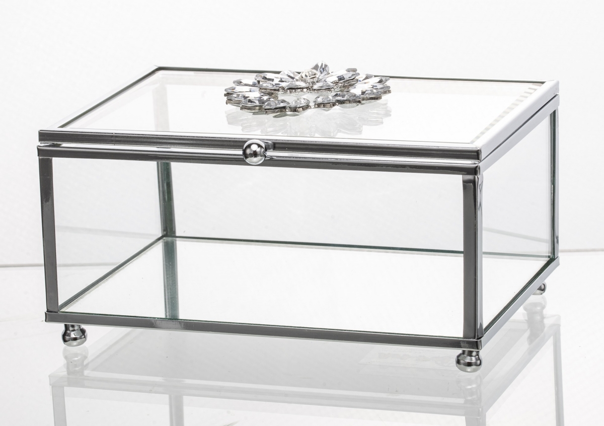 Šperkovnice dívčí prosklená, s křišťálovým květem na víčku krabičky na šperky.