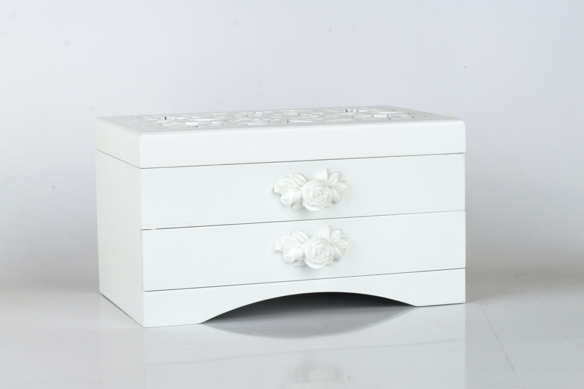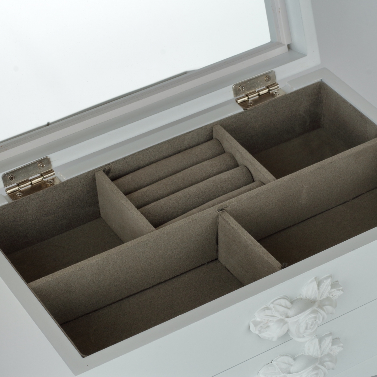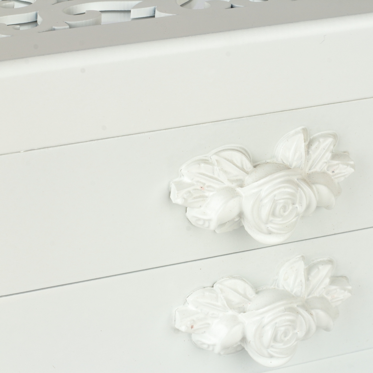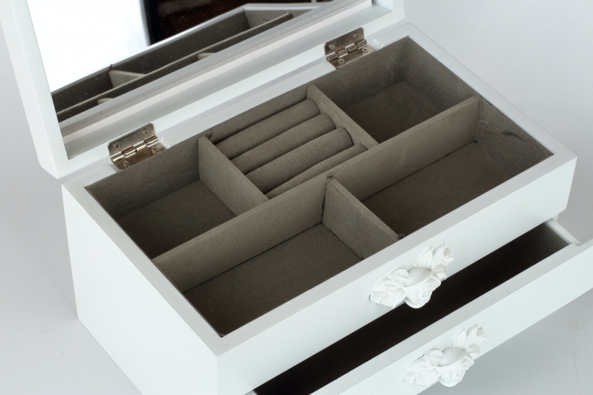 Spodní prostor šperkovnice, který je uvnitř z hebkého materiálu, je určený pro větší kousky vašich klenotů. Spodní šuplík má rozměry 21x12cm s výškou šuplíku 4cm. Úchytku šuplíku tvoří příjemně vytvarovaná polyresinová bílá růže.