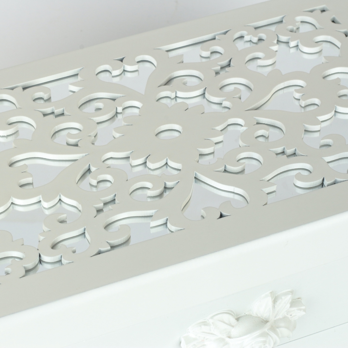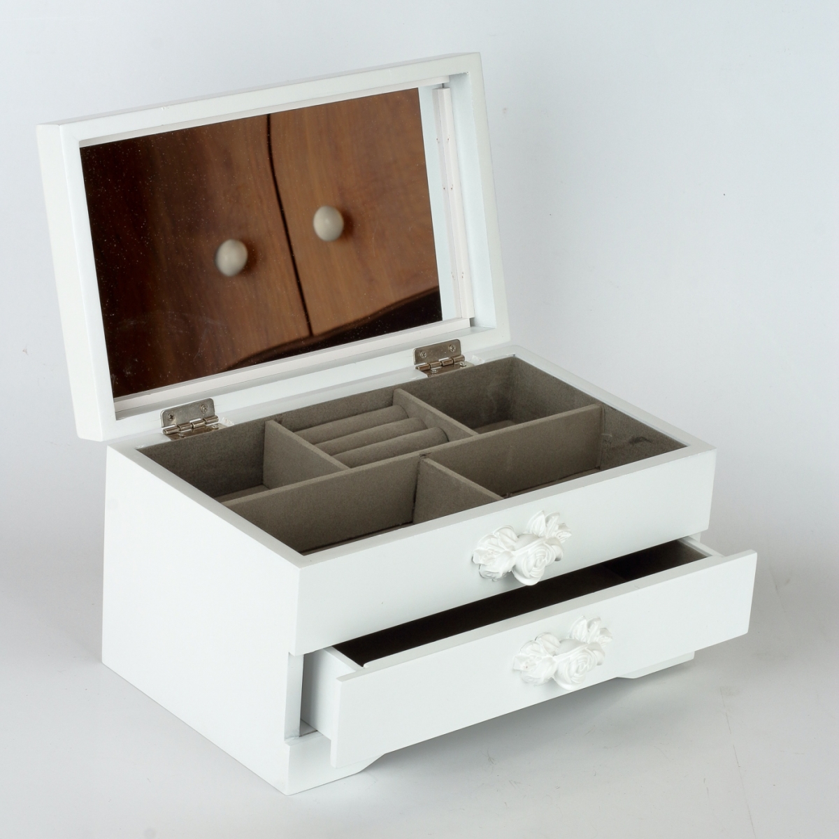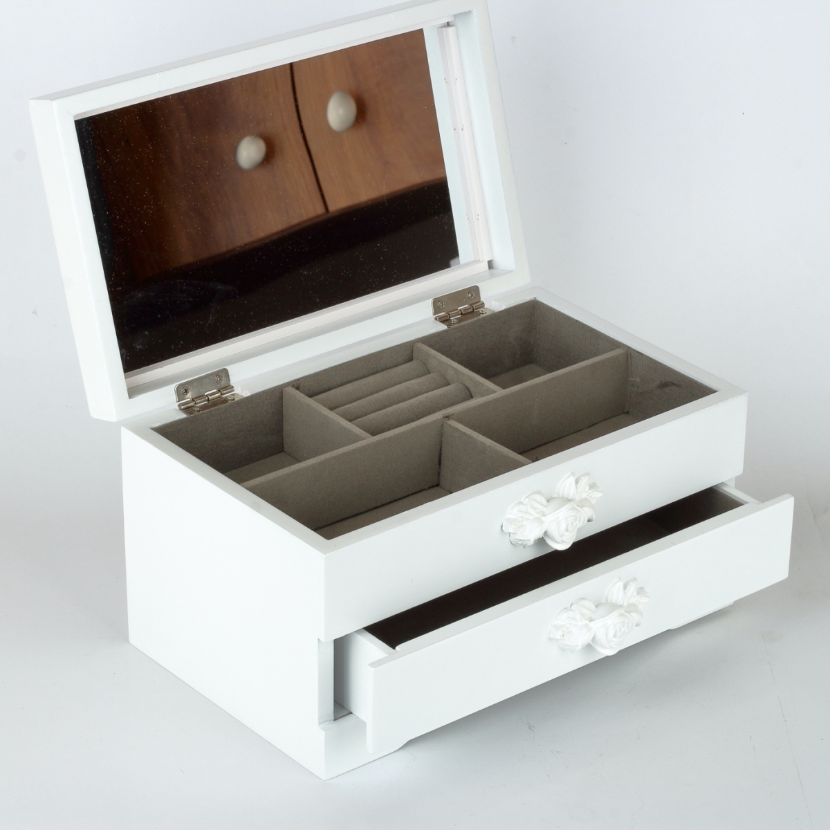 Spodní prostor šperkovnice, který je uvnitř z hebkého materiálu, je určený pro větší kousky vašich klenotů. Spodní šuplík má rozměry 21x12cm s výškou šuplíku 4cm. Úchytku šuplíku tvoří příjemně vytvarovaná polyresinová bílá růže.
