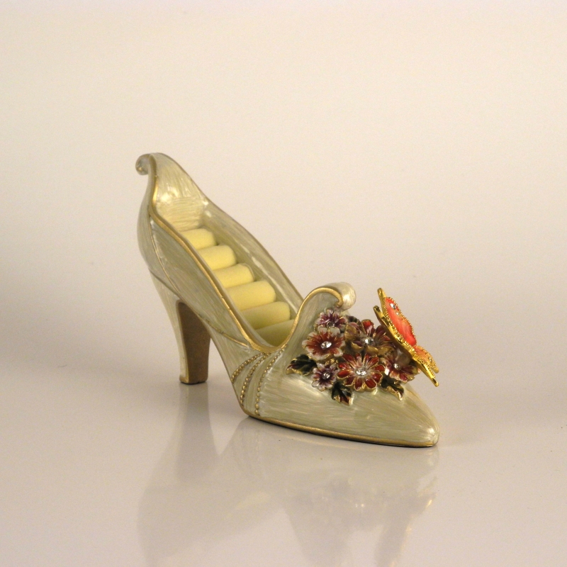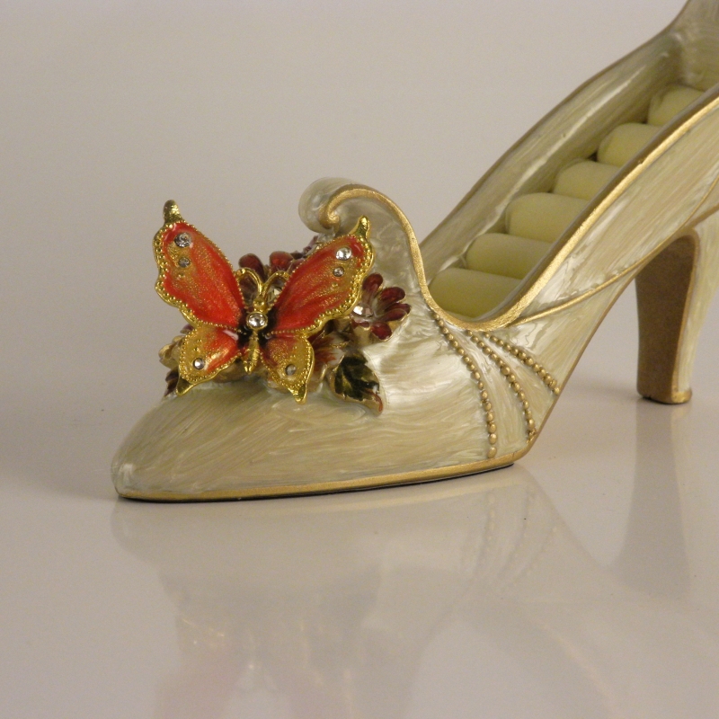 Tento „Popelčin střevíček“ je vyroben z lesklé světle zbarvené keramiky. Oranžový motýl s perličkami na křídlech je pěkným oživením celého výrobku.