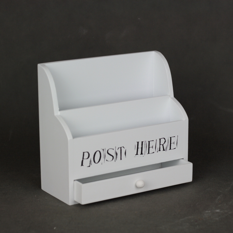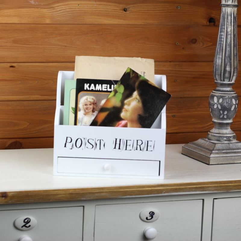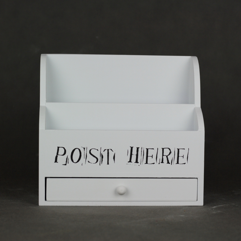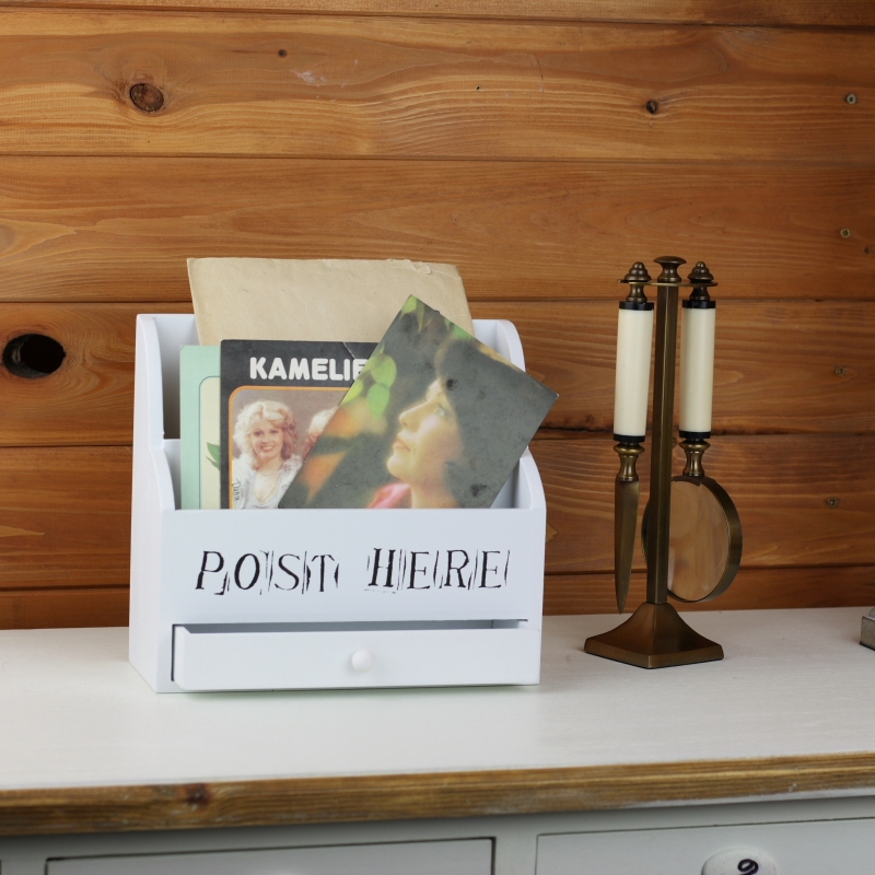 Dřevěný stojan v bílé barvě je doplněn o černý nápis Post here. Ve spodní části má stojan také tajný šuplíček např. na peníze nebo šperky.