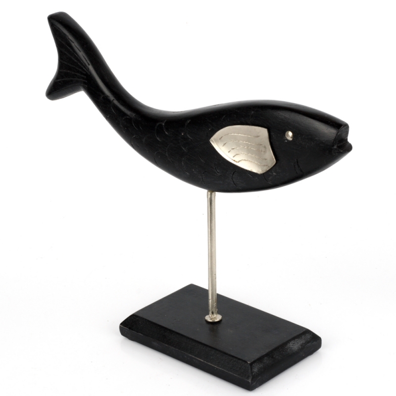 Dřevěná ryba je vsazena do podstavce stejné barvy. Ryba má kovové oko a ploutev.