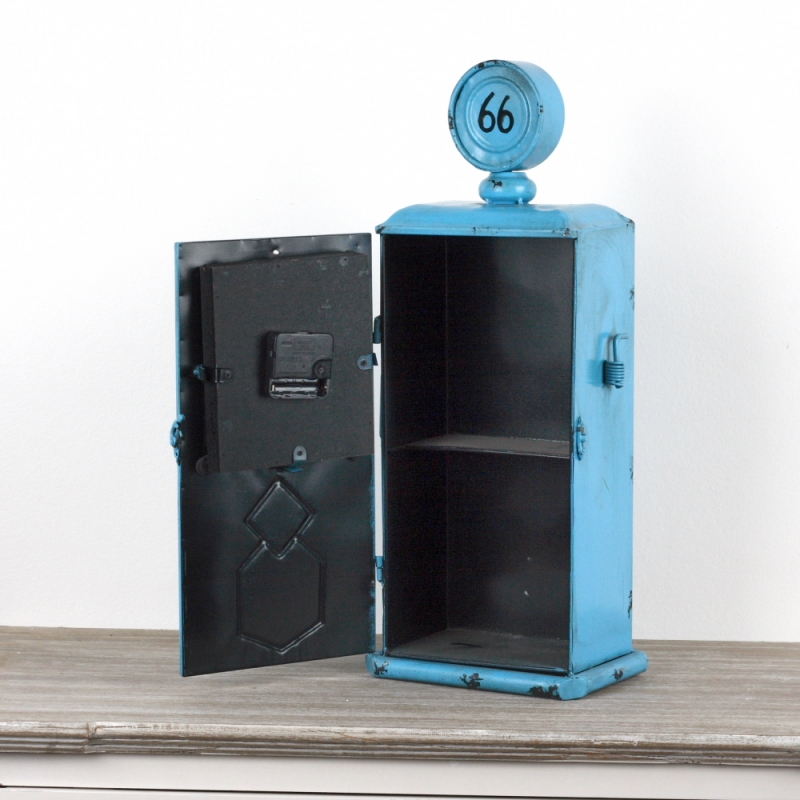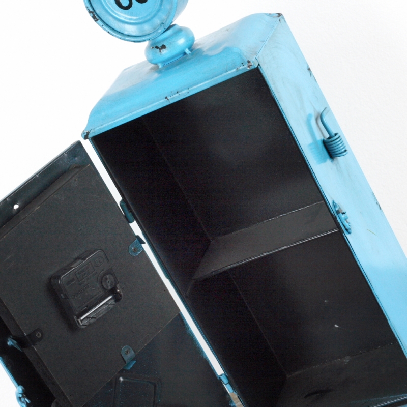 Modré kovové stolní hodiny mají otevíratelná dvířka na západku a uvnitř prostor na drobnosti. Můžete jej využít třebajako tajnou skrýš nebo na odkládání věcí, které nepoužíváte každý den, ale chcete je mít bezpečně uložené na svém místě.