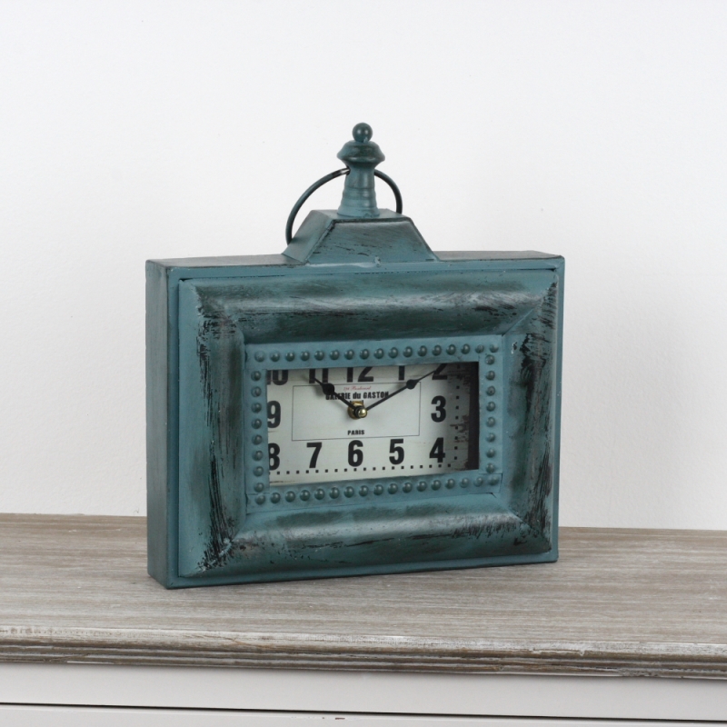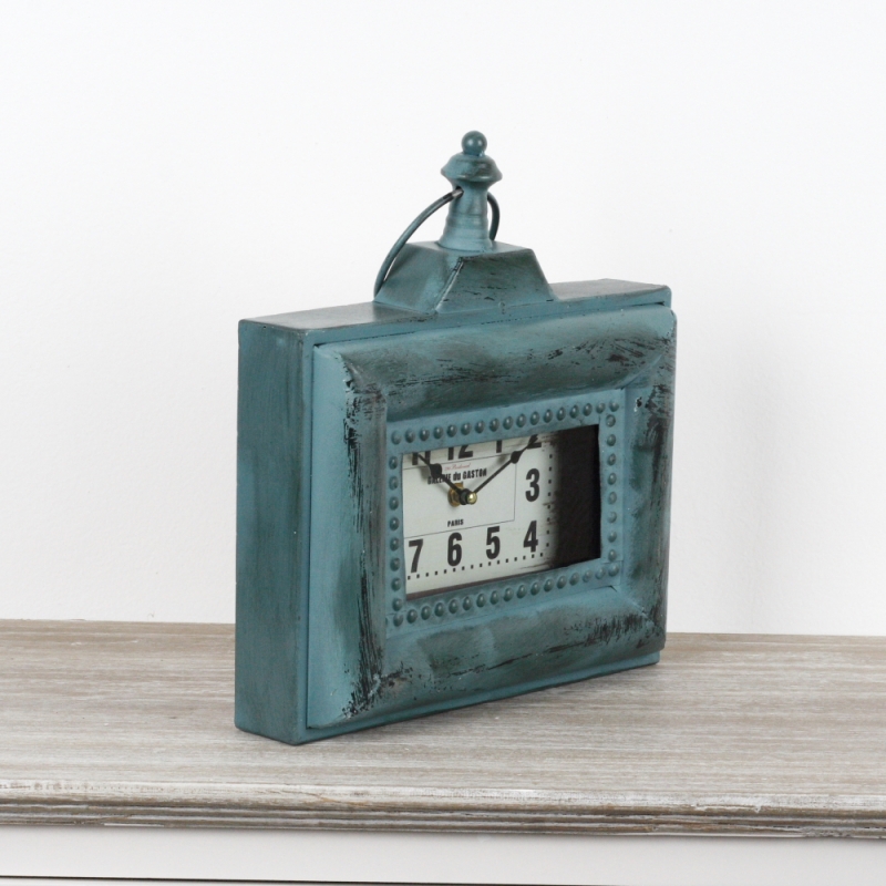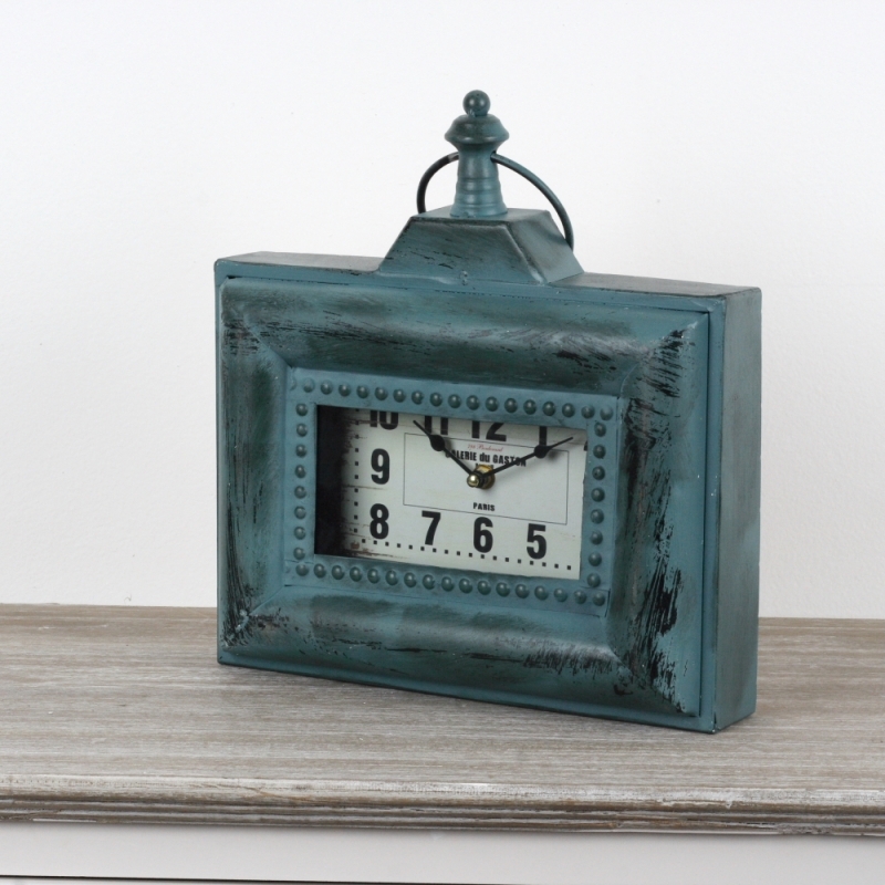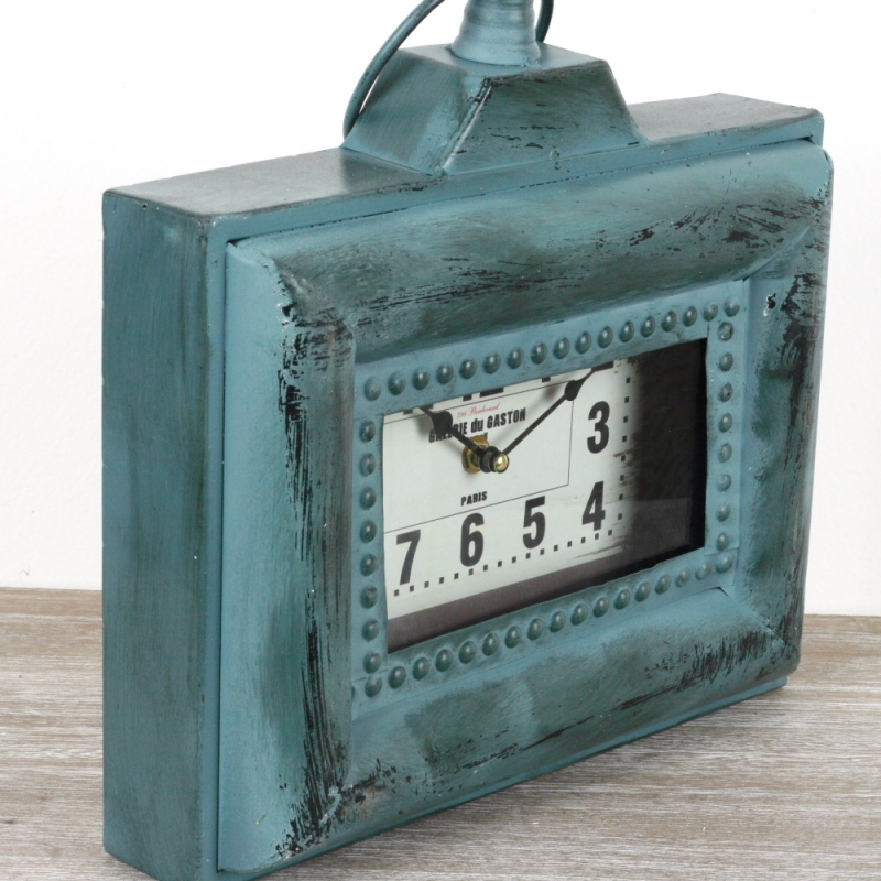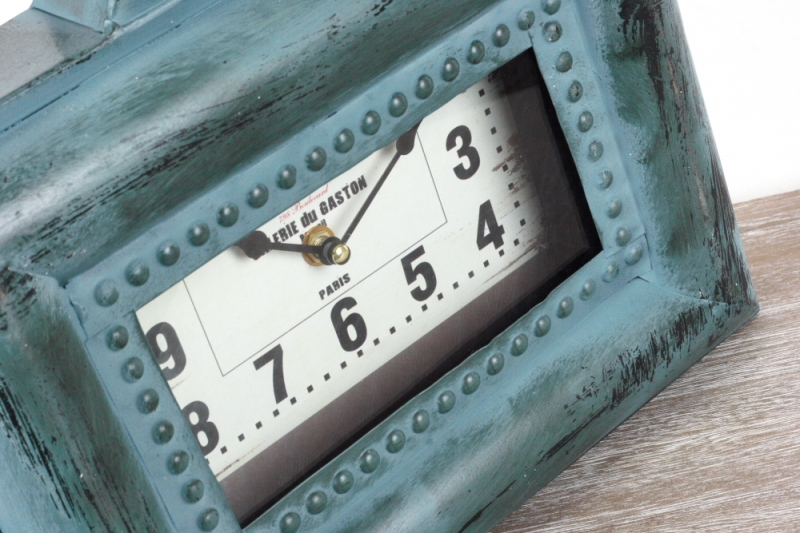 Stolní hodiny Galerie du Gaston 33x31cm v nevšední tyrkysové barvě s s oděrky a imitací povrchové koroze.