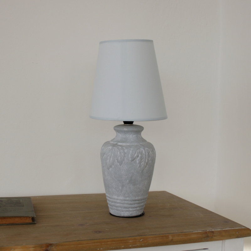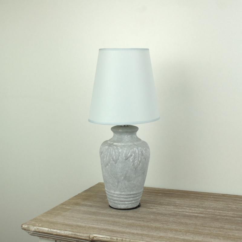 Originální lampa s bílým stínidlem je usazena na podstavci s motivem lístků. Podstavec je doplněn o moderní patinu, která dodává lampě ten správný šmrnc.