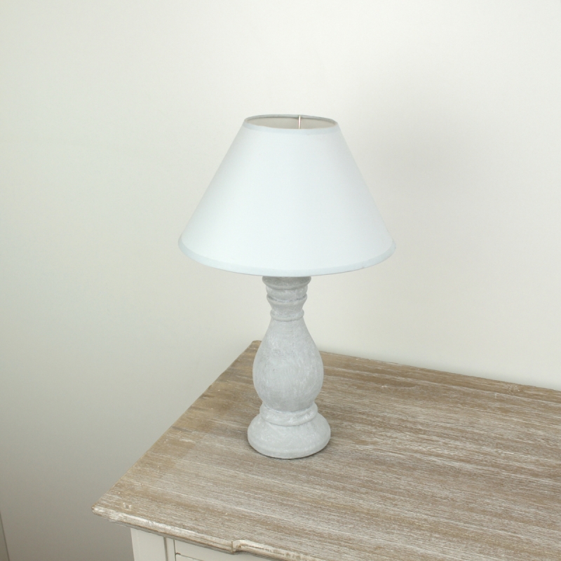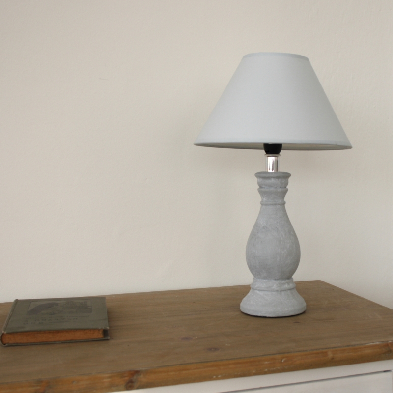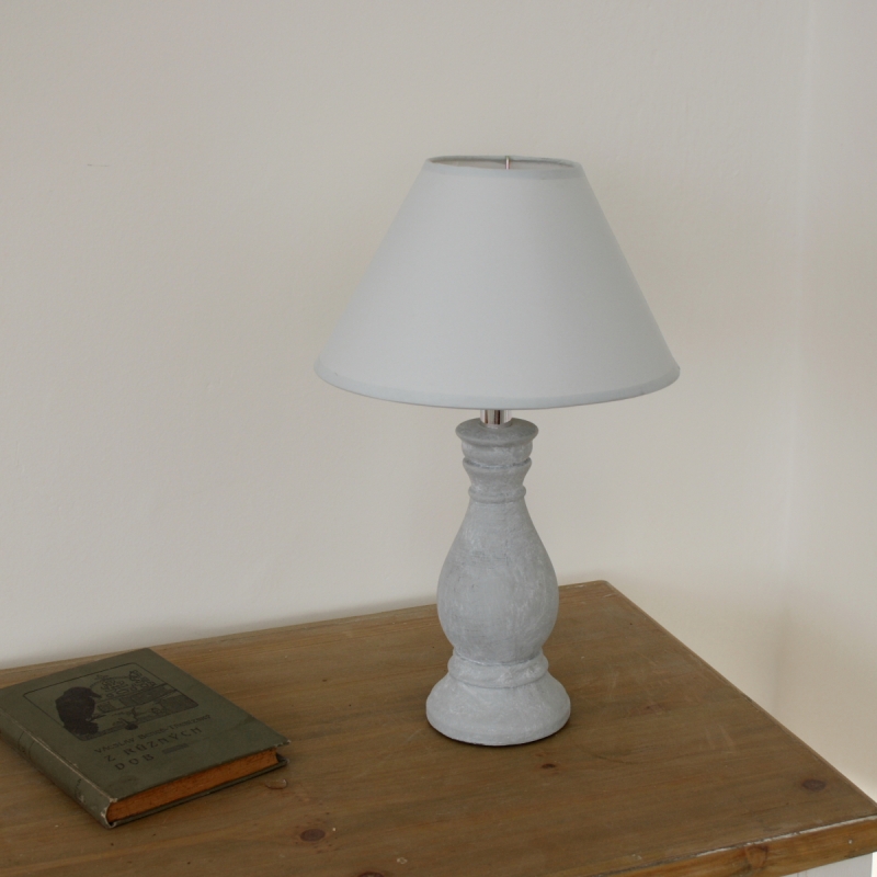 Stolní lampička šedá s podstavcem zdobeným výraznou patinou a stínidlem v bílé barvě. Jednoduchý design lampy je vhodný do moderních i venkovsky laděných interiérů. Skvěle vynikne na nočním stolku v ložnici, nejlépe v páru na konzolovém stolku nebo na vyšším stolku u sedací soupravy.