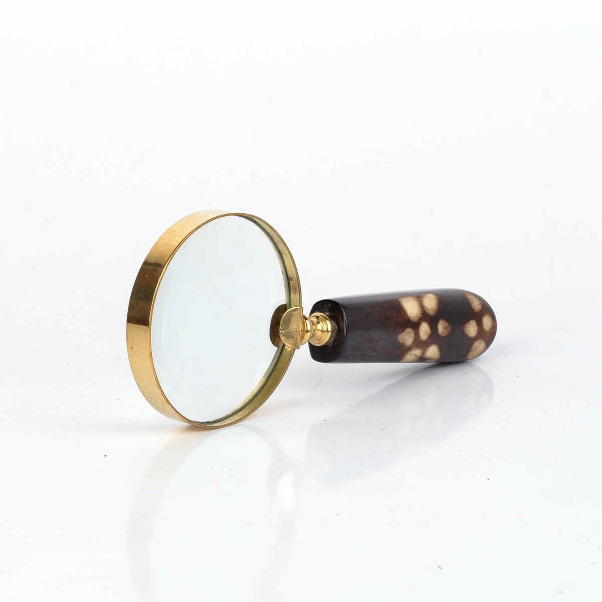 Menší stolní lupa s mosaznými prvky, ve starožitném provedení, má délku 15 cm. Průměr čočky s velmi dobrým zvětšením je 6,35 cm.