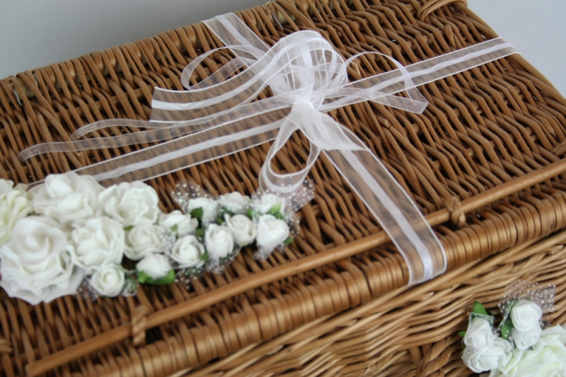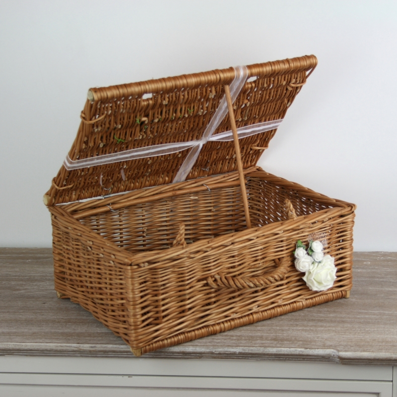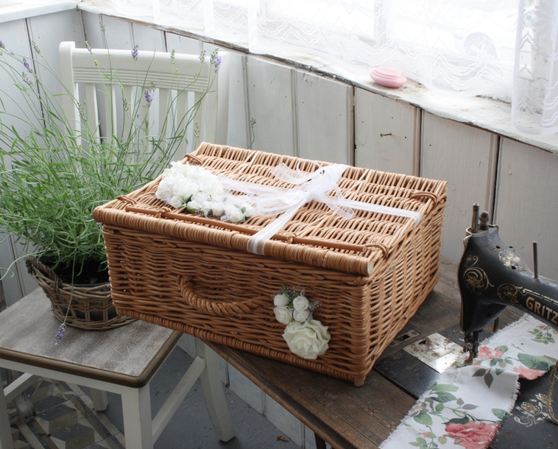 Svatební schránka na přání/ proutěný kufr 40x17x28cm Koupili jste novomanželům pár drobností do nového bydlení? Nevíte si rady, jak dárek pěkně zabalit? Využijte krásný proutěný kufřík, do kterého můžete vložit cokolic, co chcete novomanželům předat.