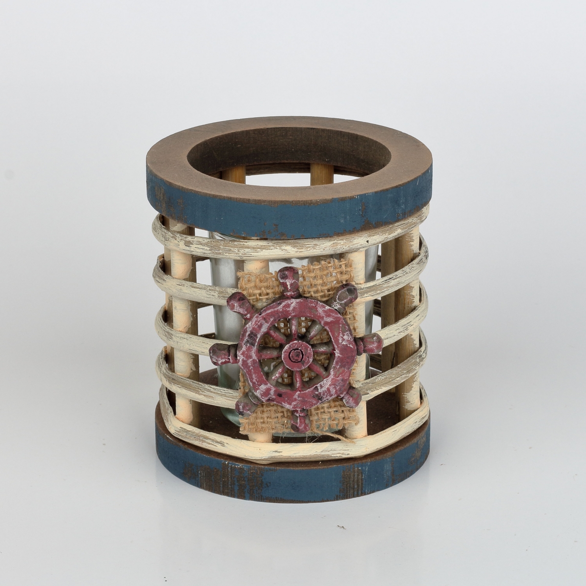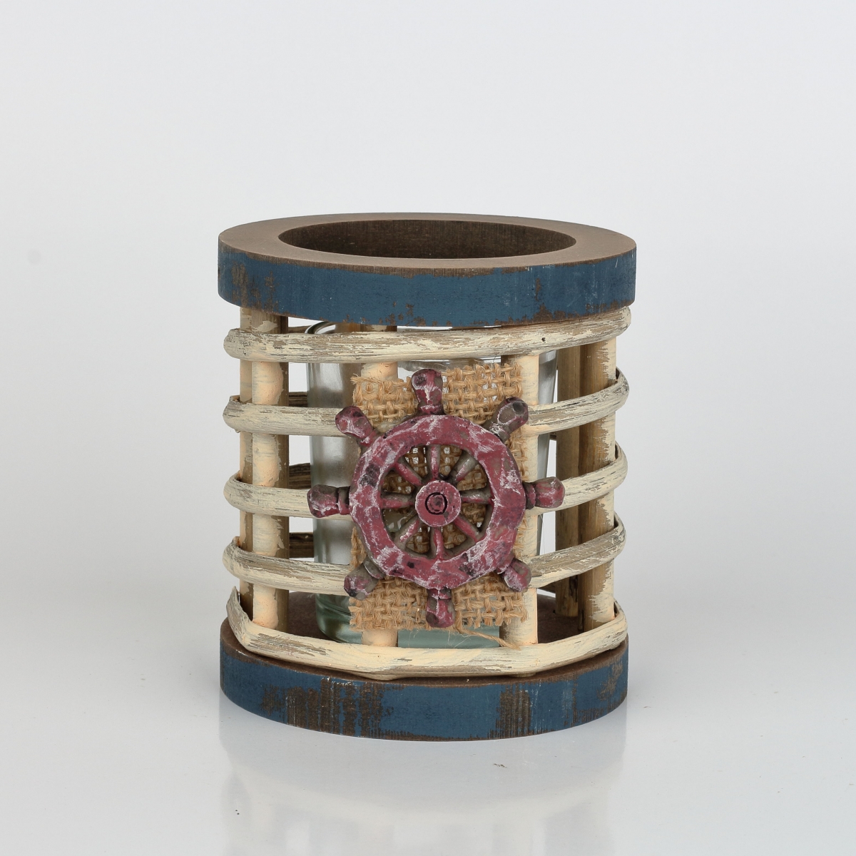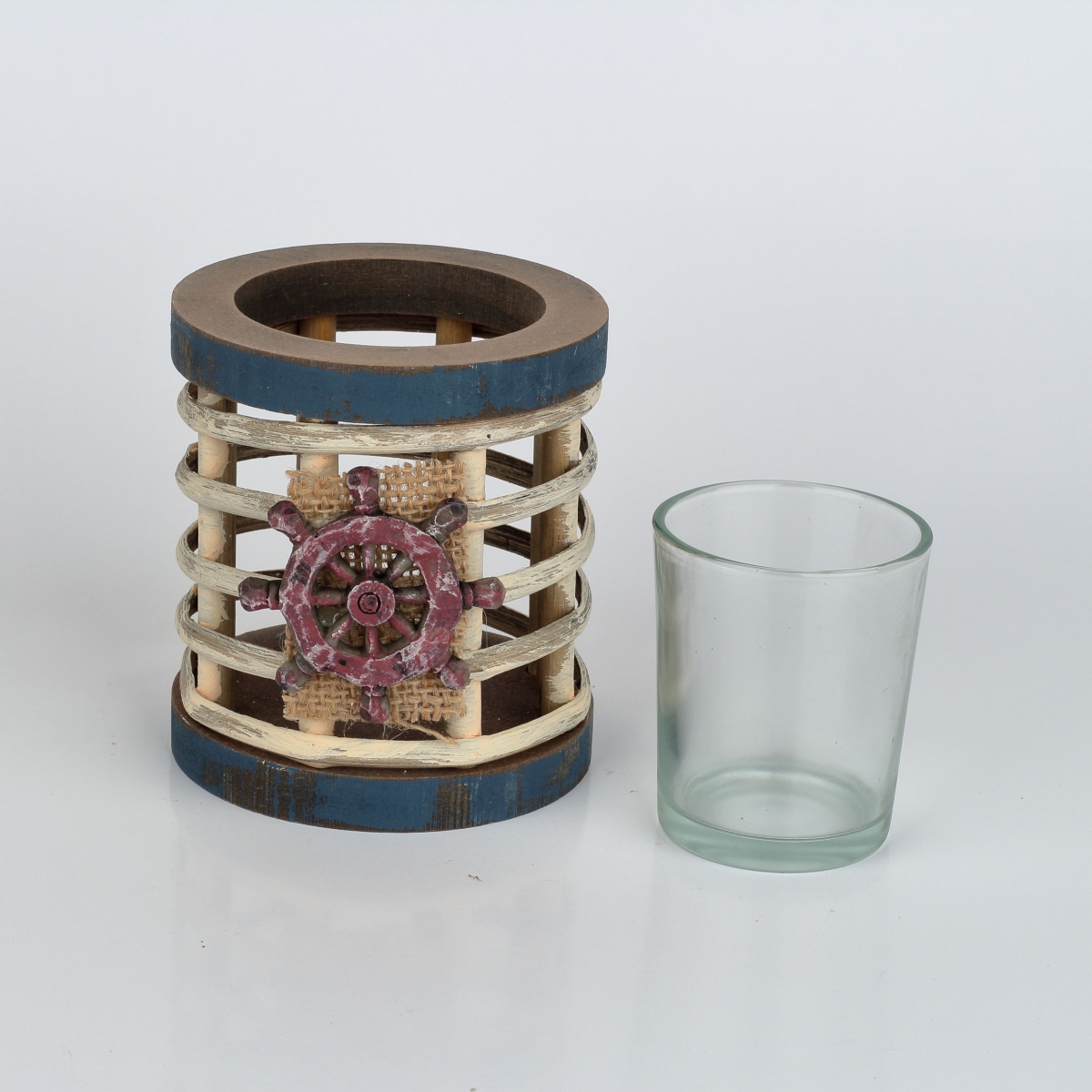 Svícen 9x9x18cm s kormidlem v rybářském stylu, pro všechny milovníky moře a vody. Svícen je dřevěný a jeho součástí je sklenička na svíčku.