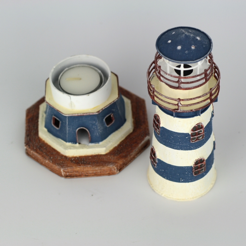 Kovový maják je vyroben ze dvou částí. Spodní je určena na čajovou svíčku, skrz okénka v horní části proniká ven světlo svíčky. Podesta má tvar osmiúhelníku o průměru 13cm.