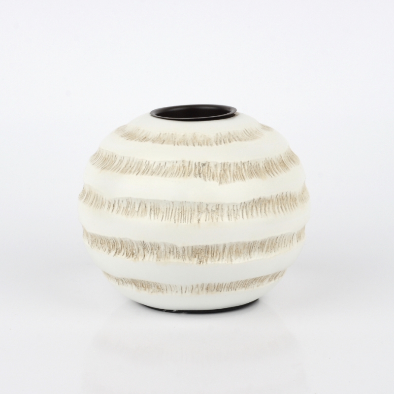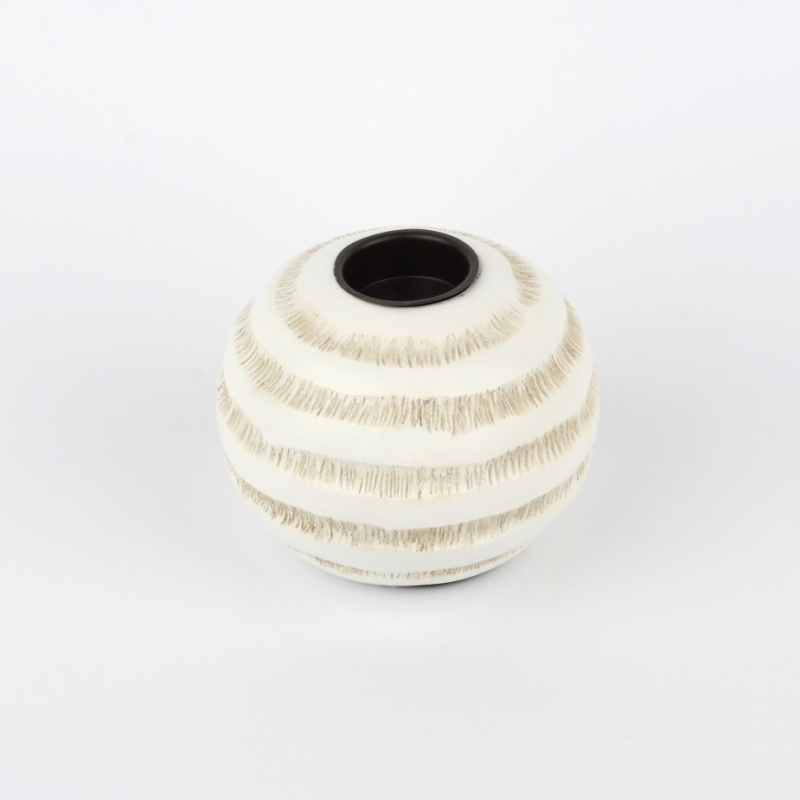 Svícen ve tavru koule má ozdobné pruhy připomínjaící rytí do dřeva.