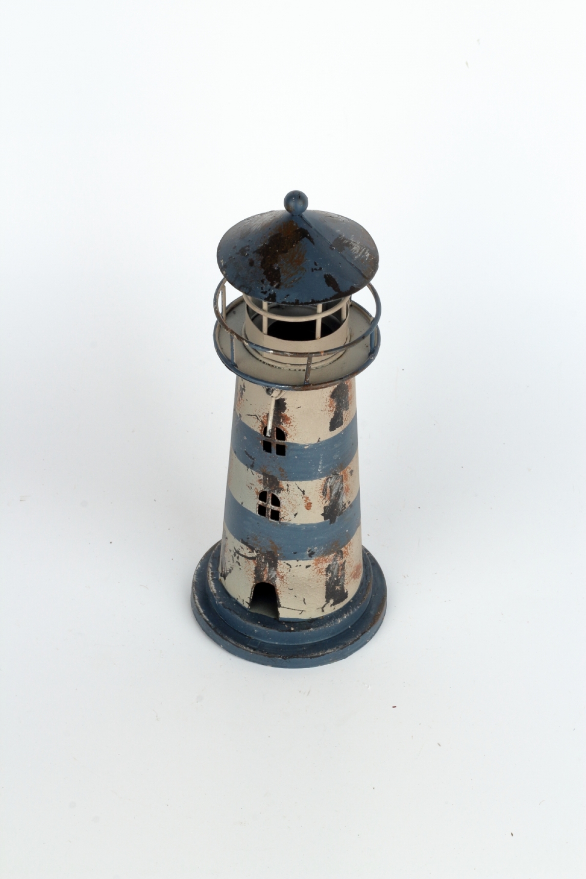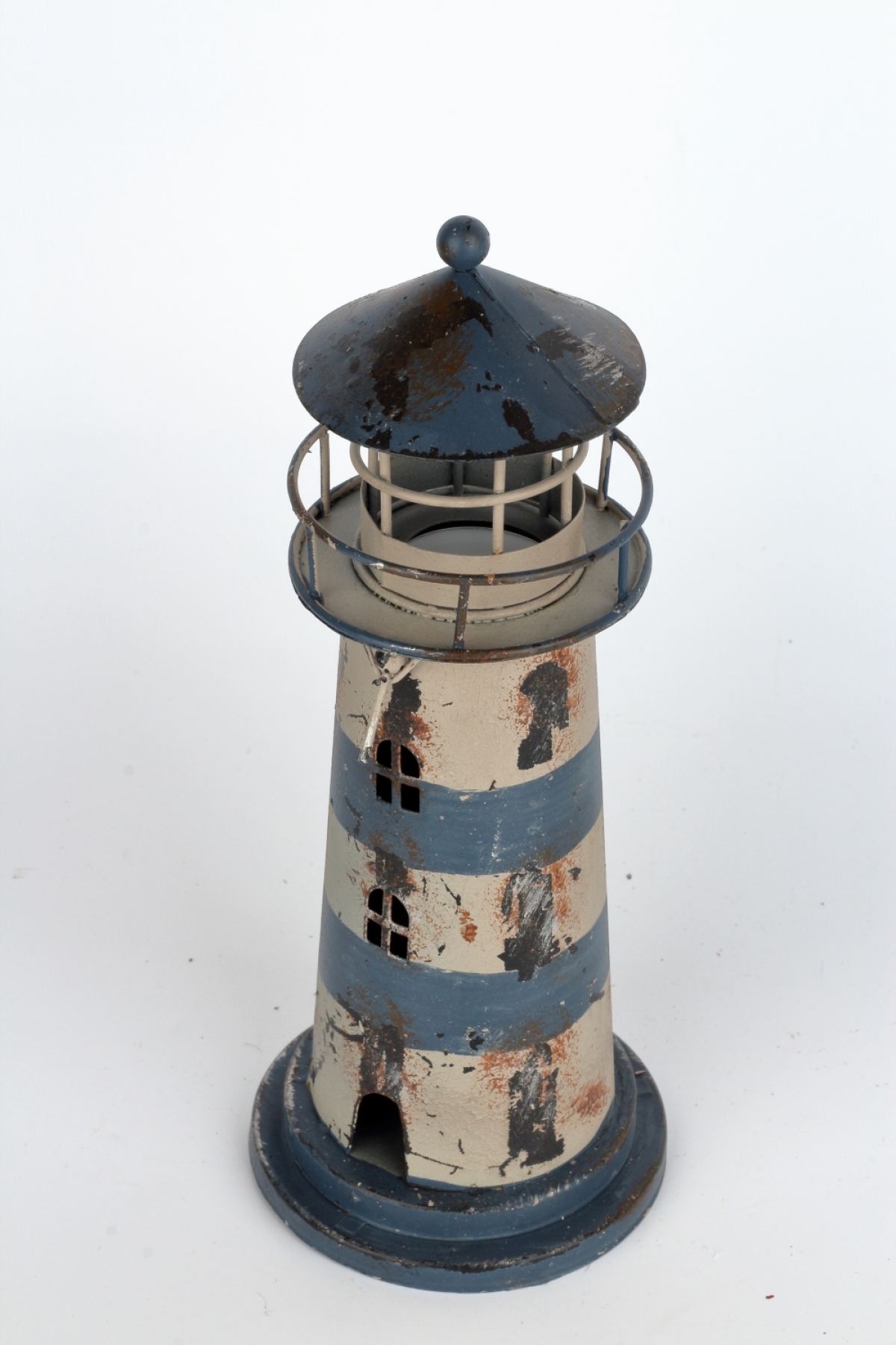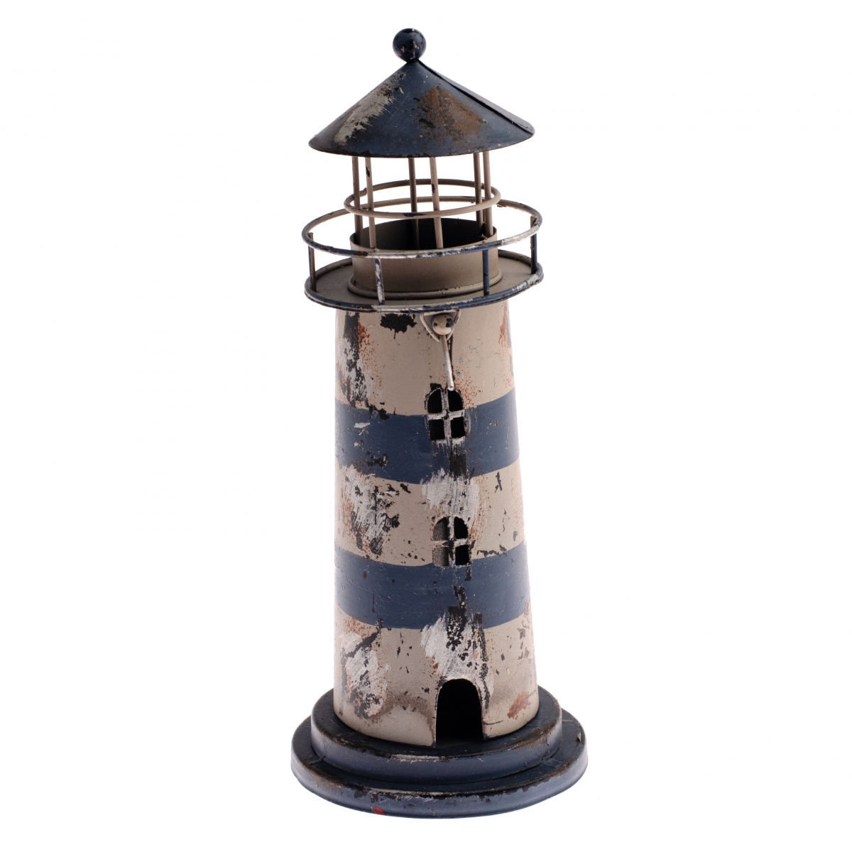 Plechový svícen ve tvaru majáku má odklápěcí stříšku, kam vložíte čajovou svíčku a po zapálení bude maják krásně svítit.