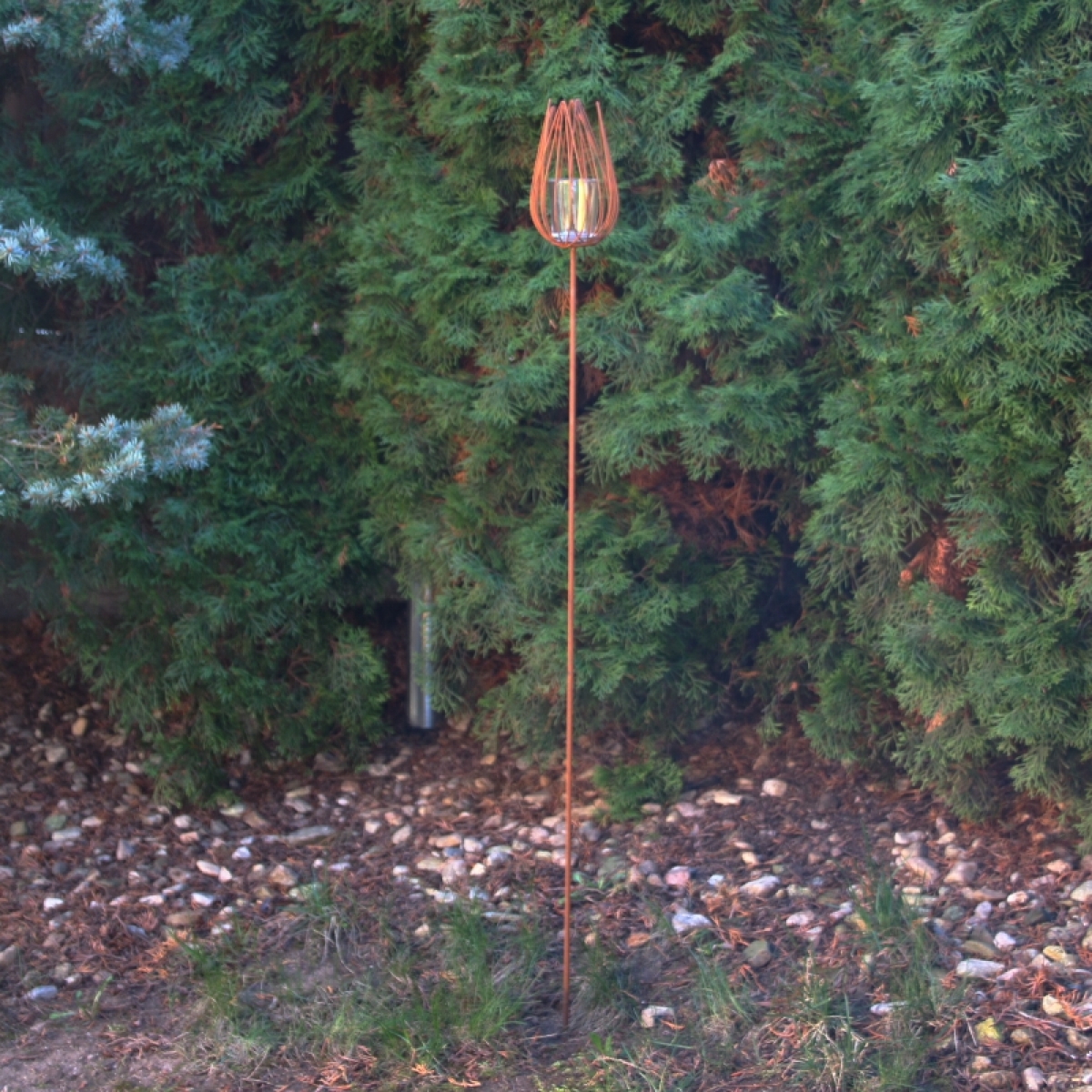 Dekorace na chalupu svícen se zápichem do trávníku.
