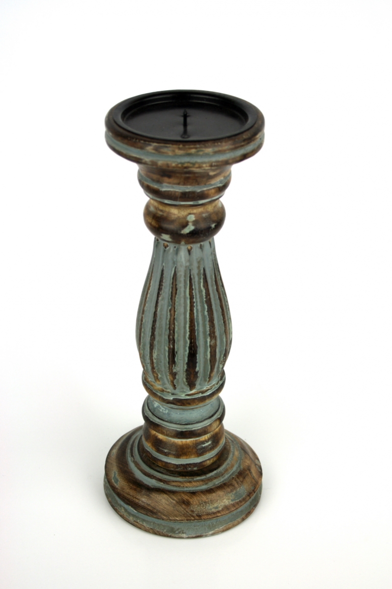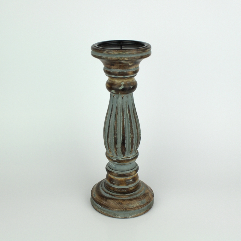 Svícen na jednu svíčku šedý 31cm je masivní, dřevěný, ručně vyřezávaný svícen v šedé a přírodní barvě se starožitnou patinou. Moderní šisování je lehce do tyrkysova.