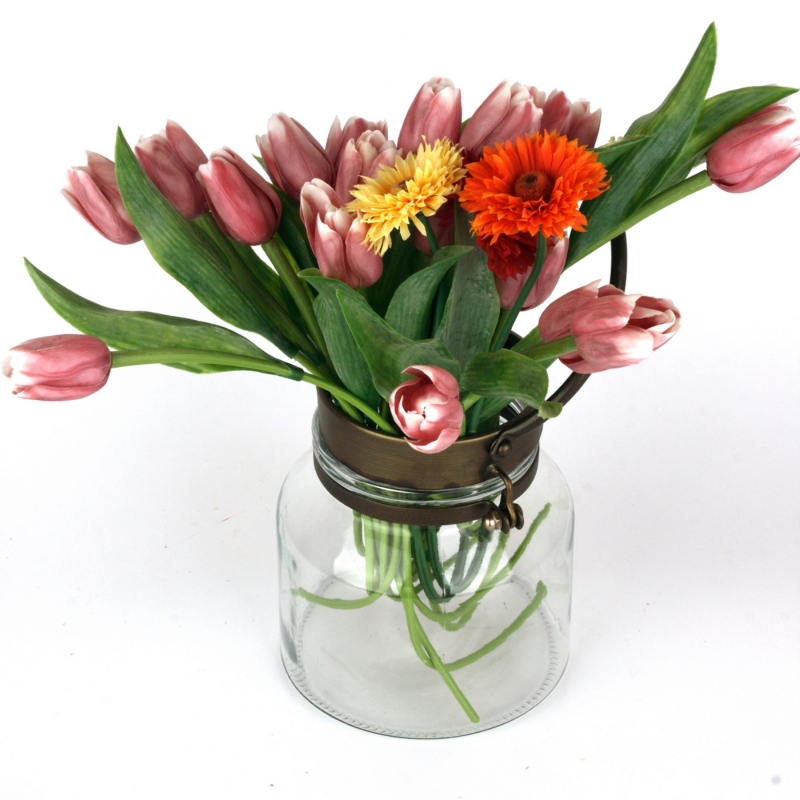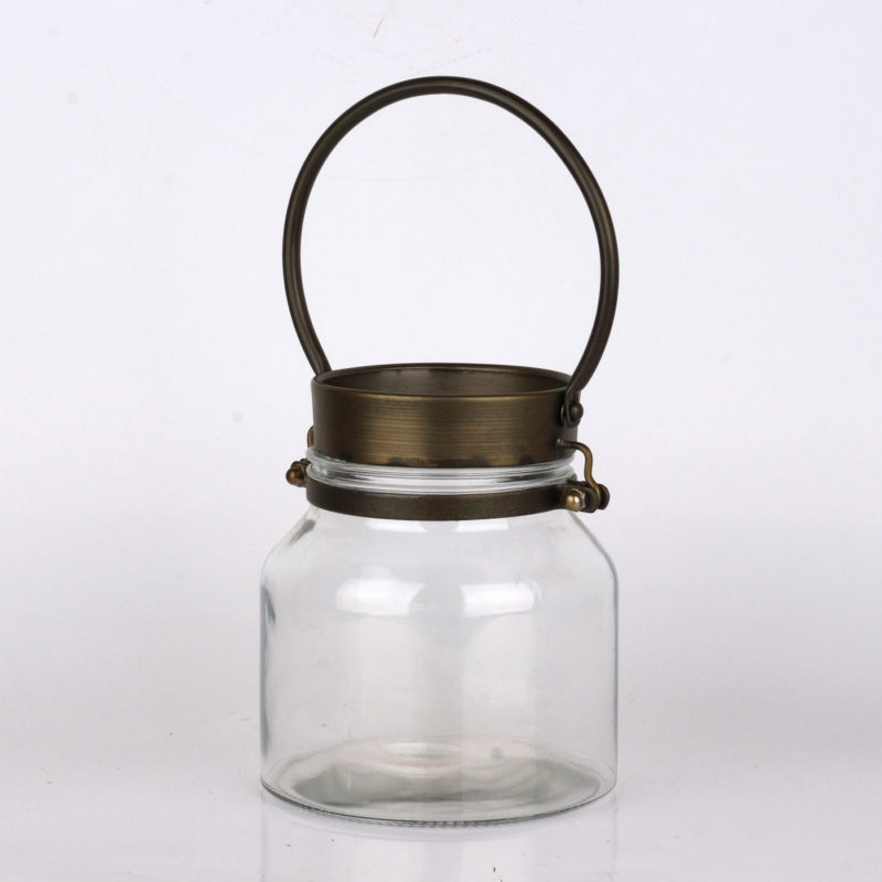 Skleněná nádoby s uchem se po vložení svíčky promění na elegantní svícen. Se svazkem květin zase na nadčasovou vázu.