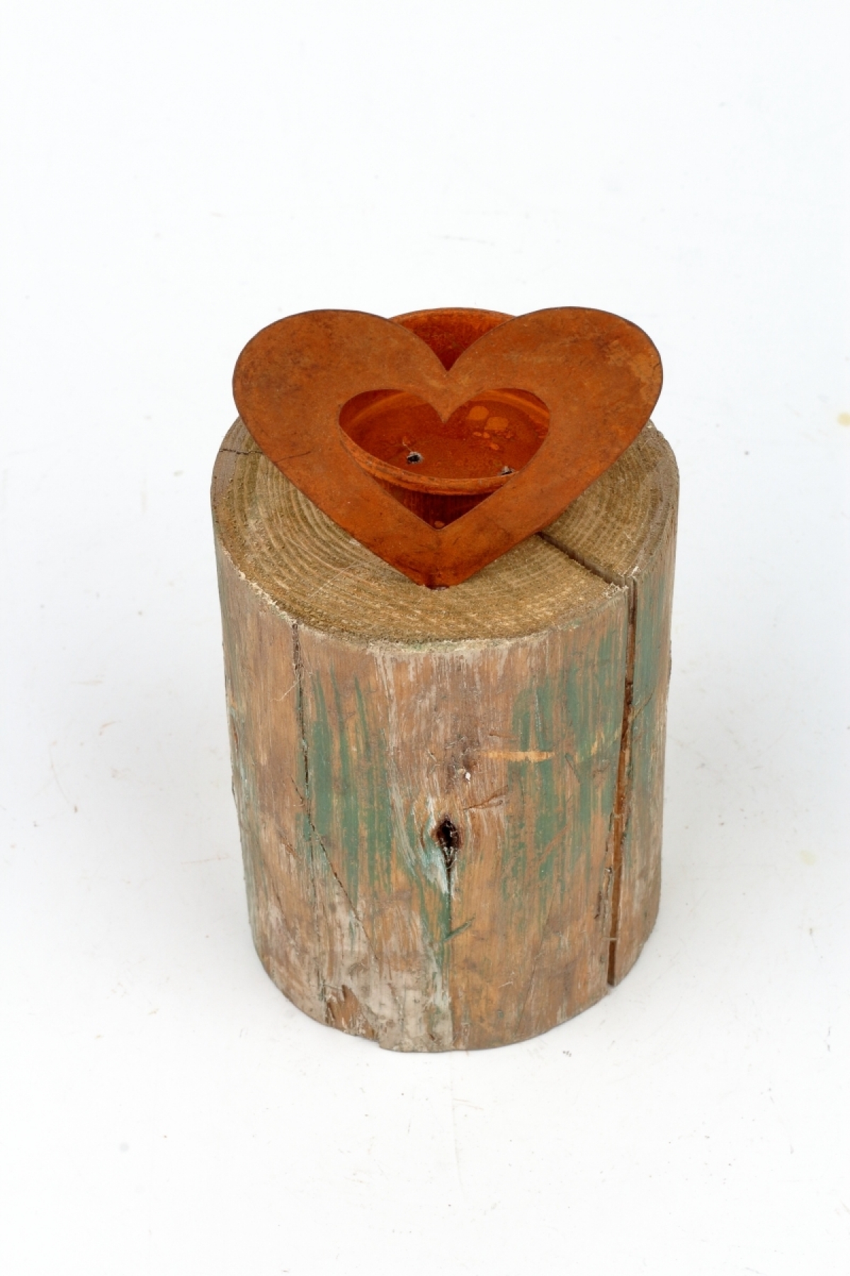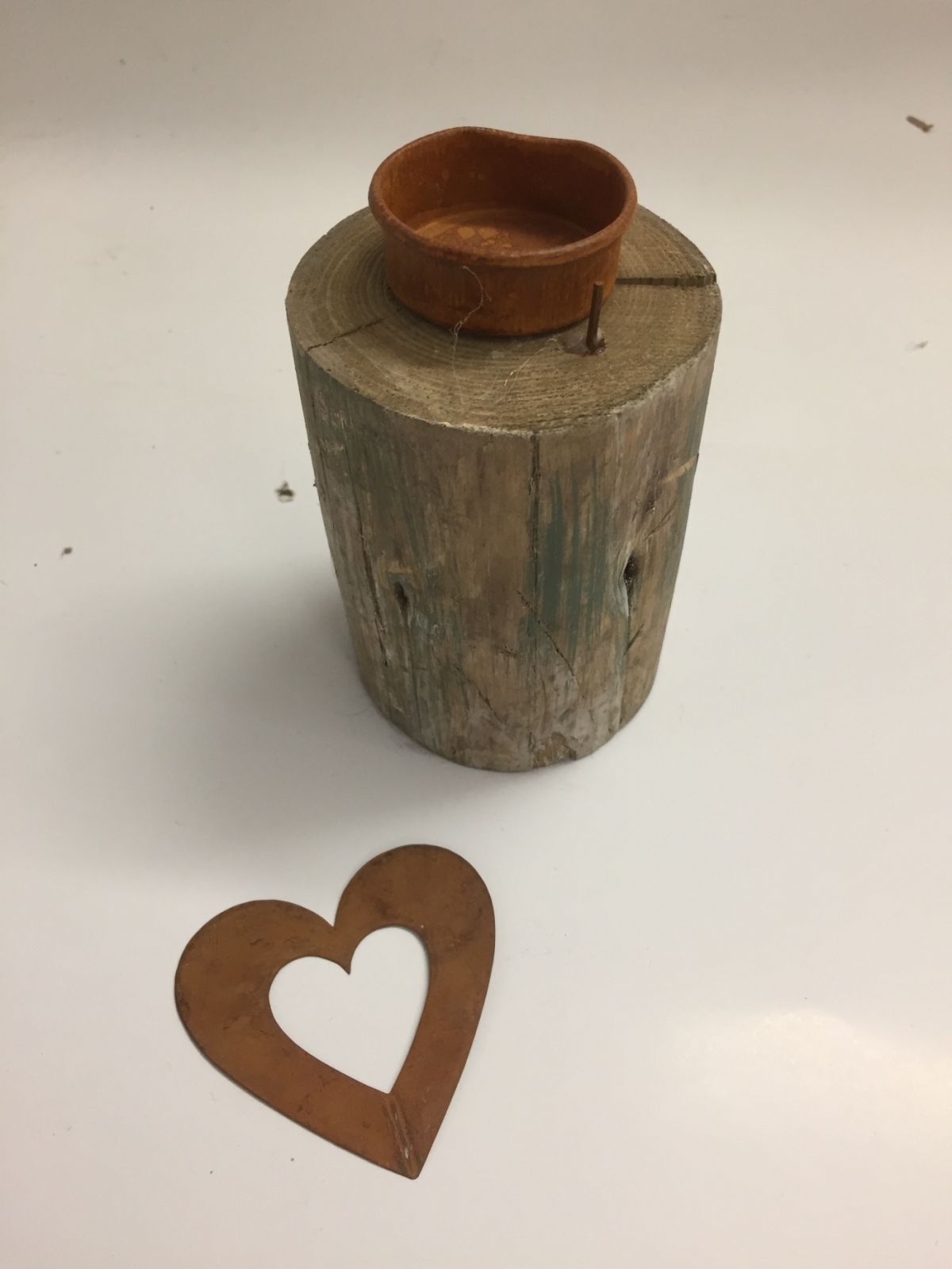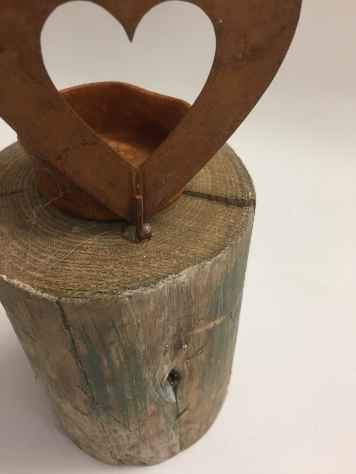 Plechový svícen na čajovou svíčku s kovovým srdíčkem na dřevěném špalíku byl vyřazen pouze z důvodu uvolnění srdíčka. Snadno opravitelné přilepením / letováním.