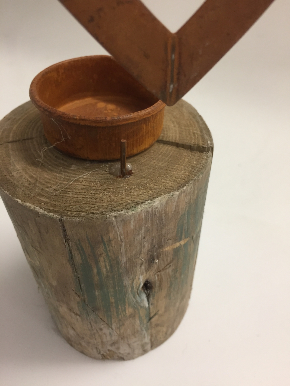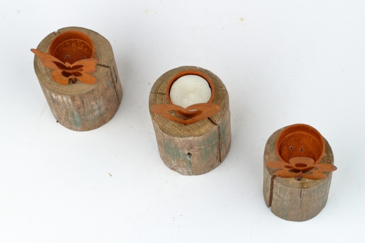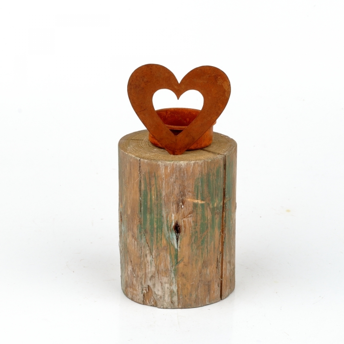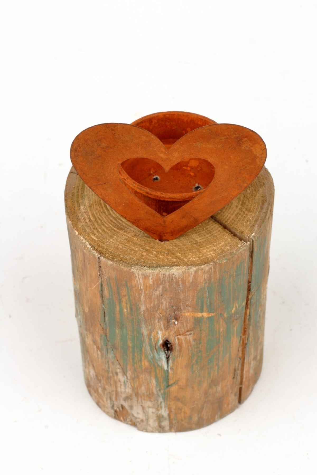 Plechový svícen na čajovou svíčku s kovovým srdíčkem na dřevěném špalíku byl vyřazen pouze z důvodu uvolnění srdíčka. Snadno opravitelné přilepením / letováním.