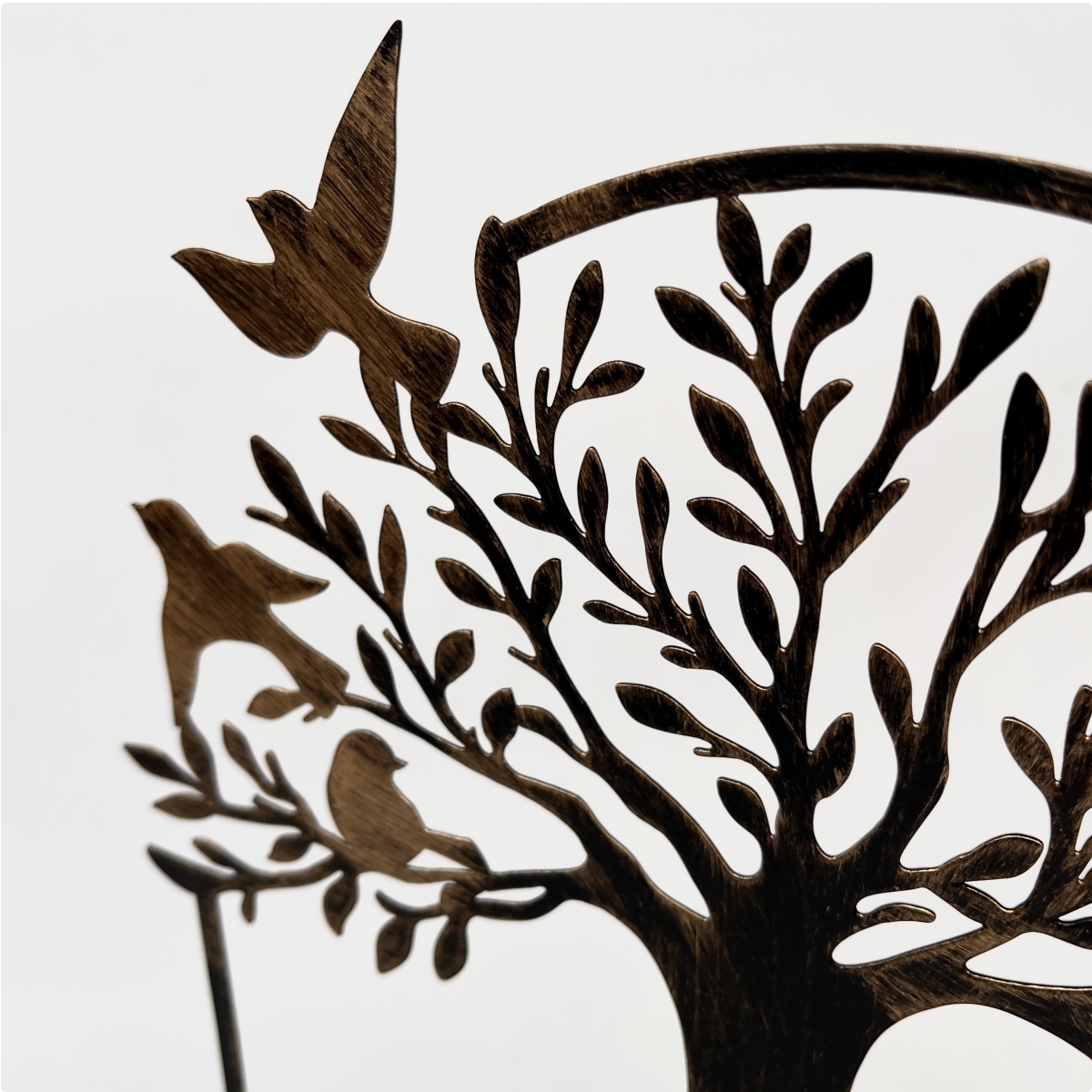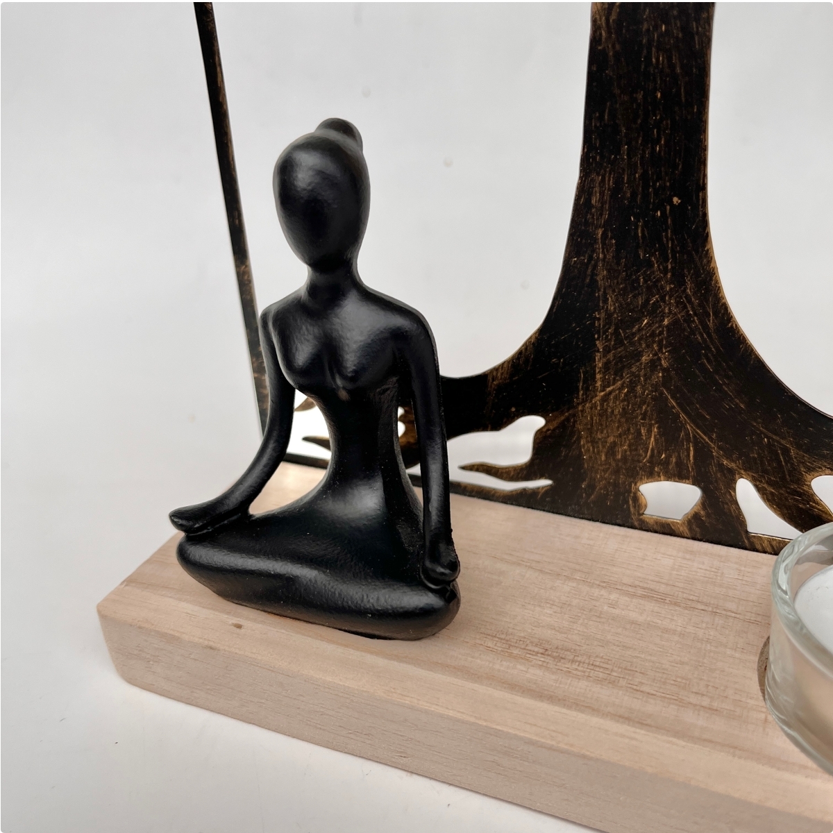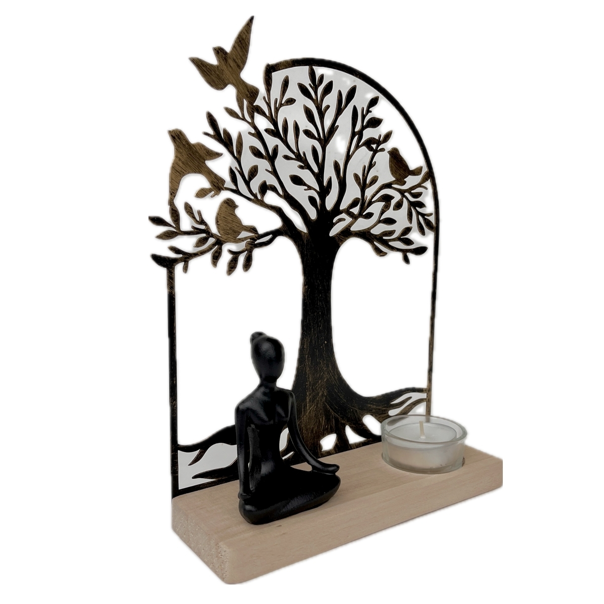 Stylový kovový svícen se dřevěným podstavcem, v jehož srdci se schovává tichý Budha před siluetou stromu života.