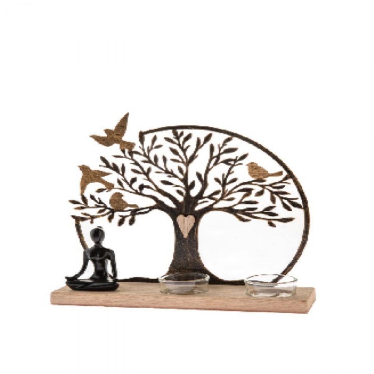 Dřevěný podstavec spojuje teplo přírody s kovovou čistotou, konstrukce je navržena tak, aby svíčka stála bezpečně. Jakmile zapálíte čajovou svíčku, celý motiv ožije – stíny stromu se rozezní, ticho se promění v příběh. Krásná dekorace pro chvíle klidu, meditace nebo nálady.