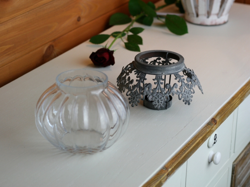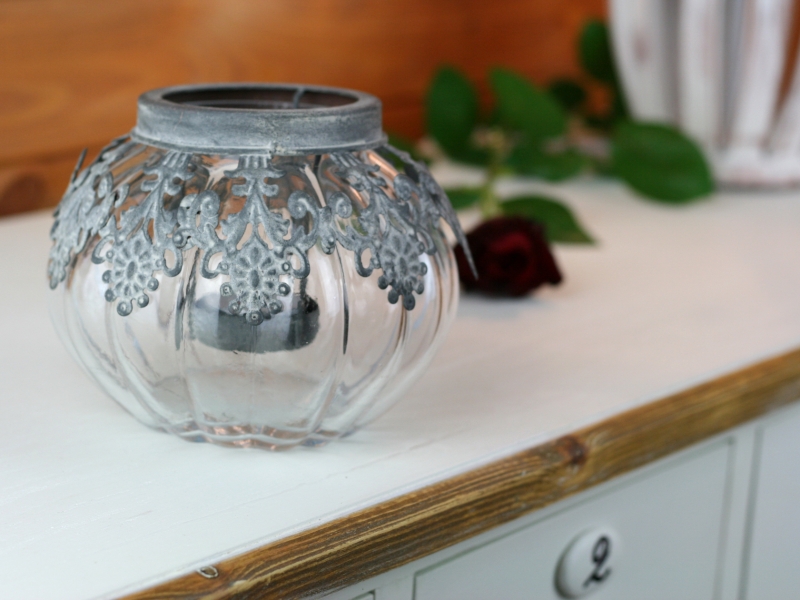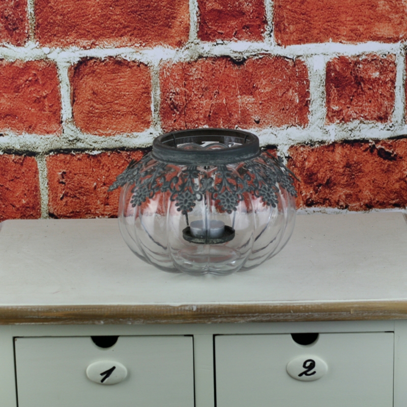 Svícen Vintage 14cm jehož skleněné tělo připomíná tvar dýně je ozdobeno rkásnou kovovou vsadkou na čajovou svíčku. Jak praktické. Kovové zdobení jednoduše vytáhnete z nádoby a zapálenou svíčku umístíte do kalíšku.