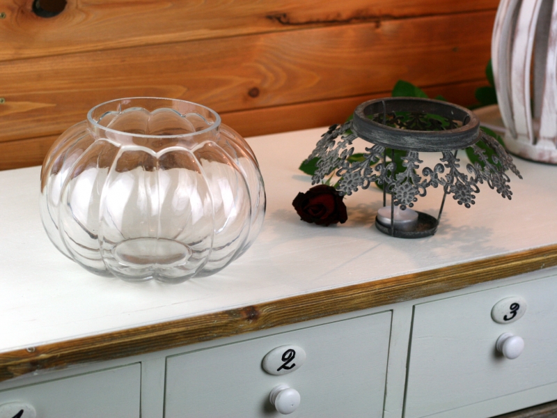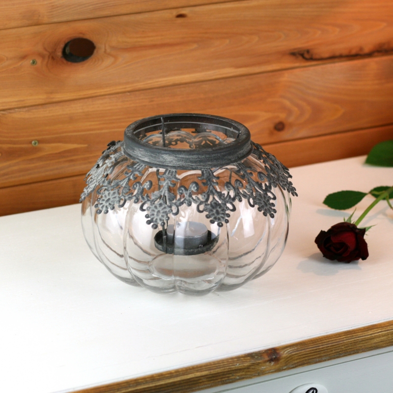 Svícen Vintage 16cm jehož skleněné tělo připomíná tvar dýně je ozdobeno krásnou kovovou vsadkou na čajovou svíčku. Jak praktické. Kovové zdobení jednoduše vytáhnete z nádoby a zapálenou svíčku umístíte do kalíšku.