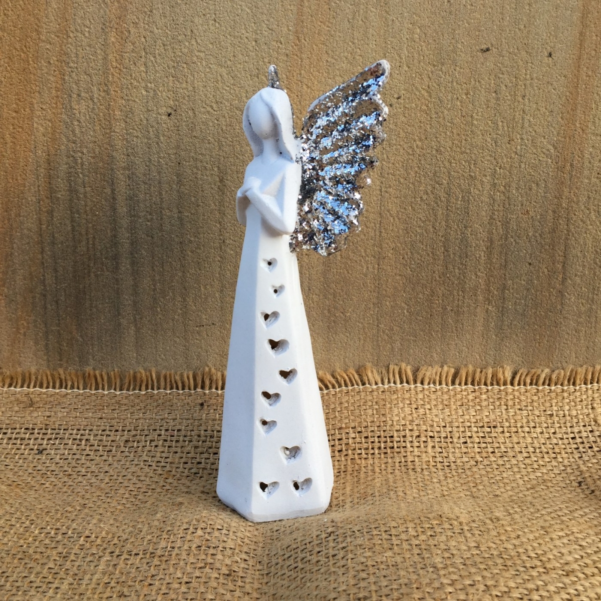 Svítící anděl je vyrobený z polyresinu v bílém provedení a křídly zdobenými stříbrným posypem. Srdíčka na šatech andílka prosvítí LED světýlka, která jsou ukrytá uvnitř.