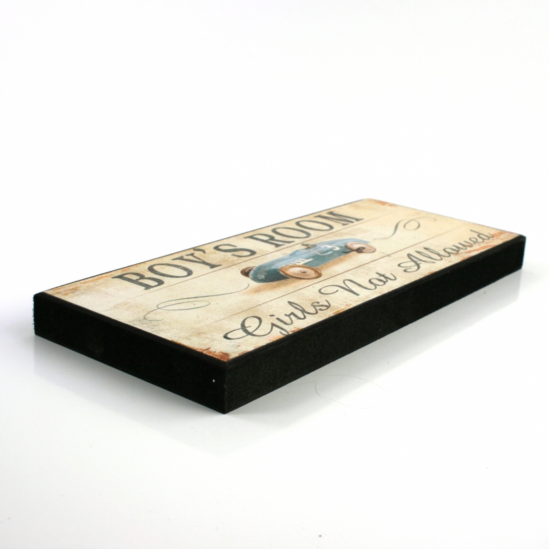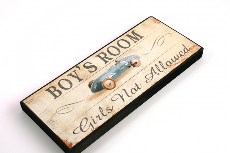 Tabulka Boys Room každému napovídá, že za dveřmi s touto cedulkou se nachází chlapecké království. A kdo by nechtěl anglickým slovíčkům rozumět, rozluští tajemství díky obrázku, vždyť málokterá holčička by si na svůj pokojíček věsila obrázek autíčka.
