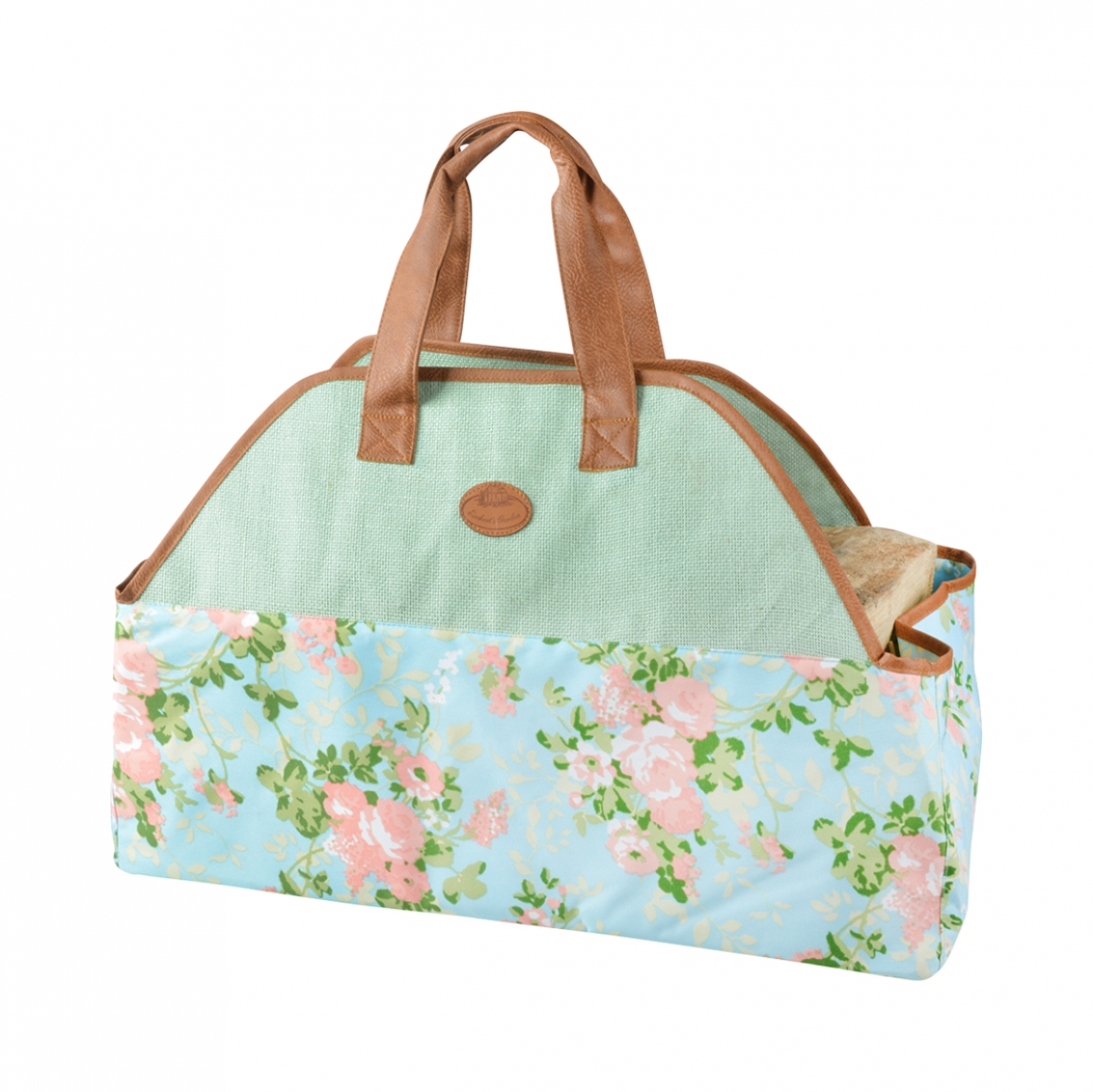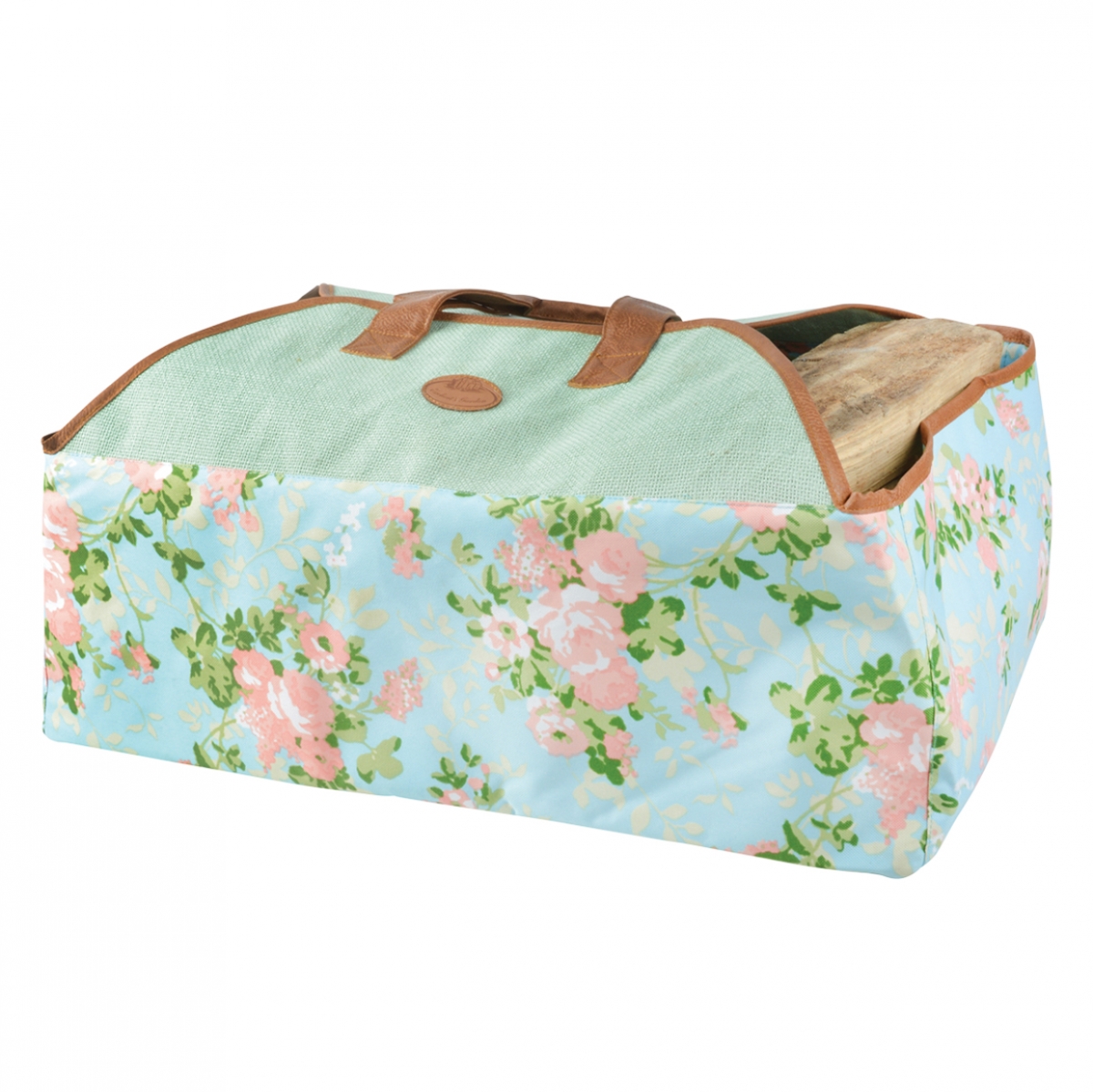 Každé romantické srdce zaplesá nad touto taškou na dřevo. Motiv růžových růží na světle modrém podkladu, je doplněn zelenou horní částí s hnědými uchy a lemováním.
