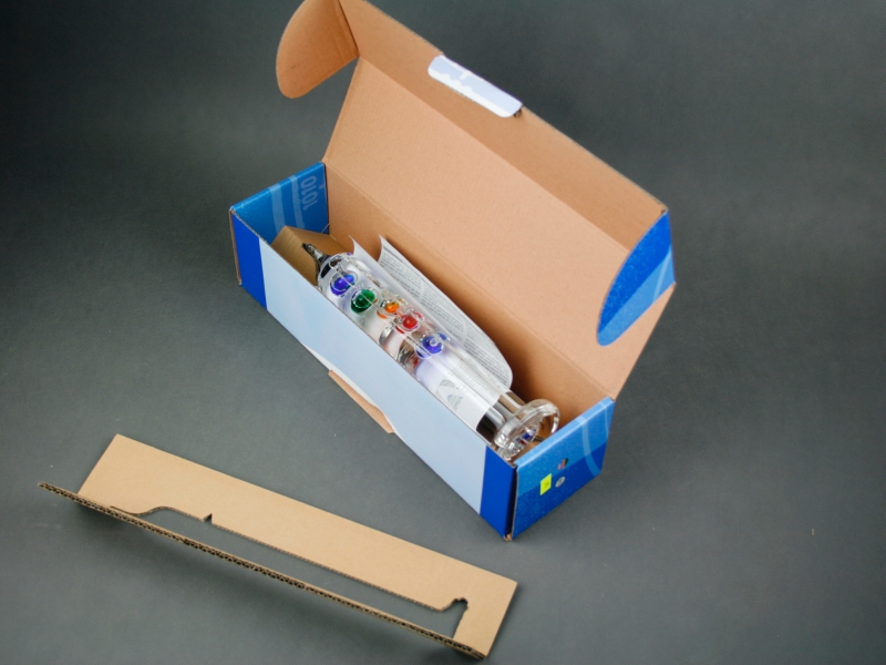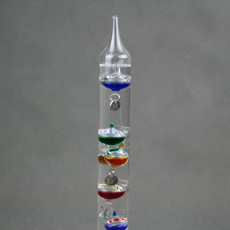 Teploměr Galileo-Galilei středníbyl zhotoven podle návodu Galileo Galilei (1564-1642). Geniální Galileo Galilei objevil při výzkumu měření teploty tuto metodu: do válce naplněného tekutinou vložil 4-5 přesně zvážených kuliček, které pak podle teploty v tekutině klesaly nebo stoupaly. Tím dostal údaje o teplotě.
