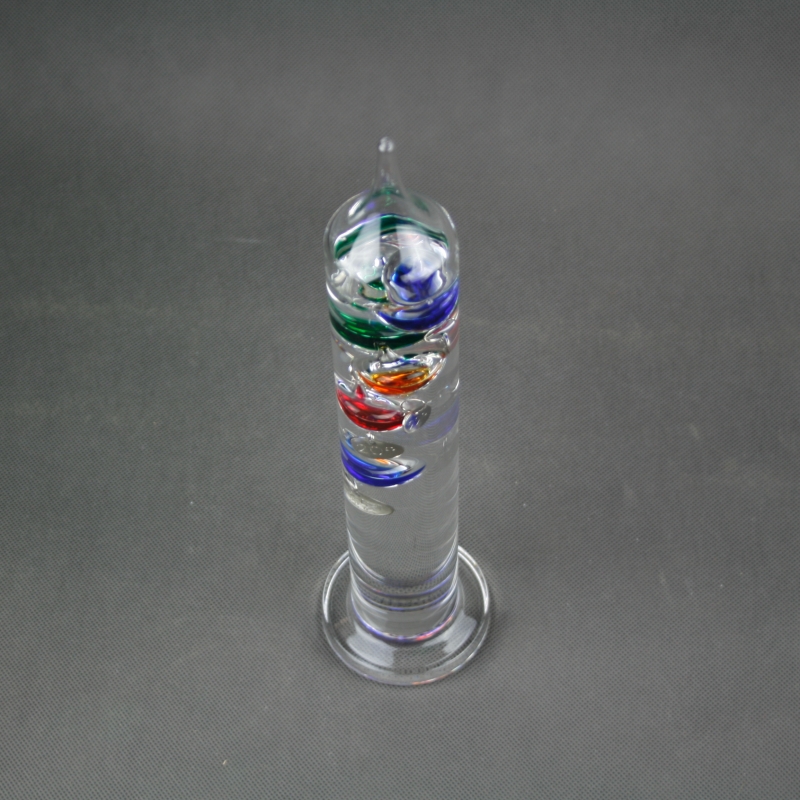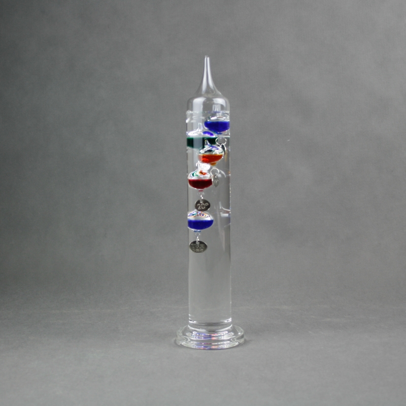 Teploměr Galileo-Galilei velkýbyl zhotoven podle návodu Galileo Galilei (1564-1642). Geniální Galileo Galilei objevil při výzkumu měření teploty tuto metodu: do válce naplněného tekutinou vložil 4-5 přesně zvážených kuliček, které pak podle teploty v tekutině klesaly nebo stoupaly. Tím dostal údaje o teplotě.