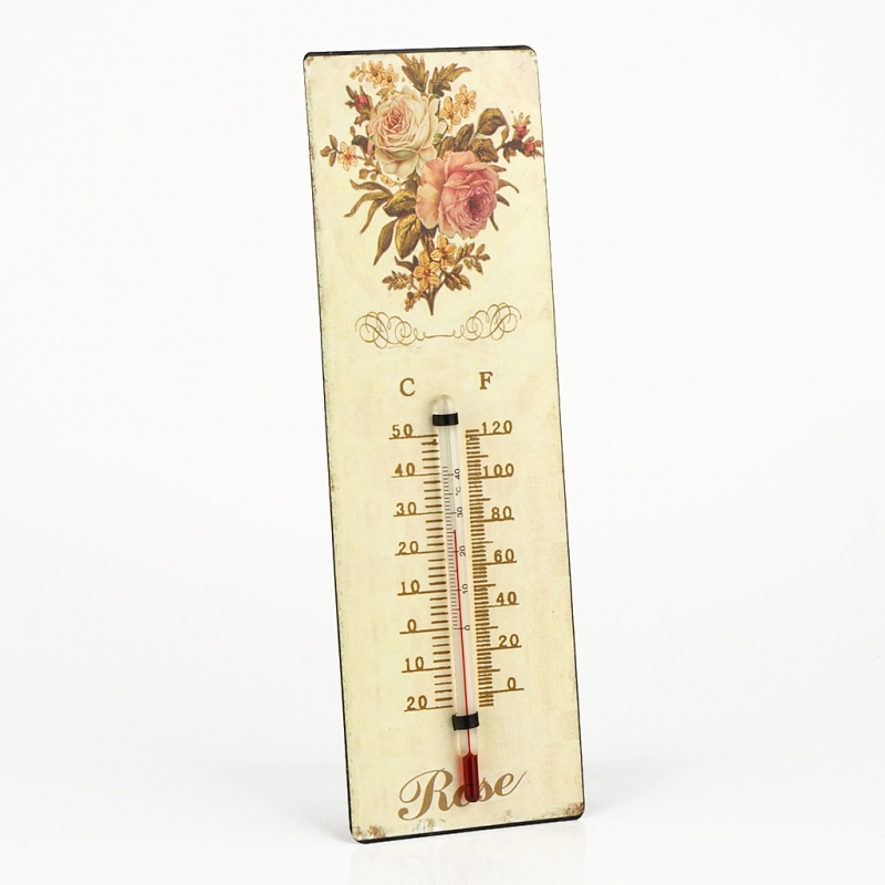 Teploměr kovový růže 8x25cm v překrásném retro stylu.