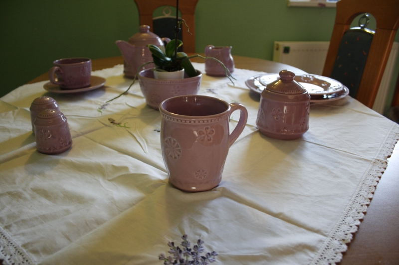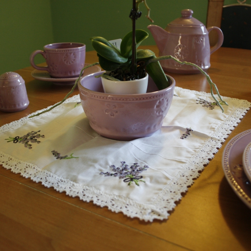 Ubrus na obrázku je obdélníkového tvaru. Jeho rozměry jsou 32 x 41 cm. Ubrus je vyrobený z bavlny. Zdobí ho bavlněná krajka a nádherná levandulová výšivka. V každém rohu ubrusu je vyšitý svazeček levandule, mezi nimi najdete vyšitou levandulovou snítku.