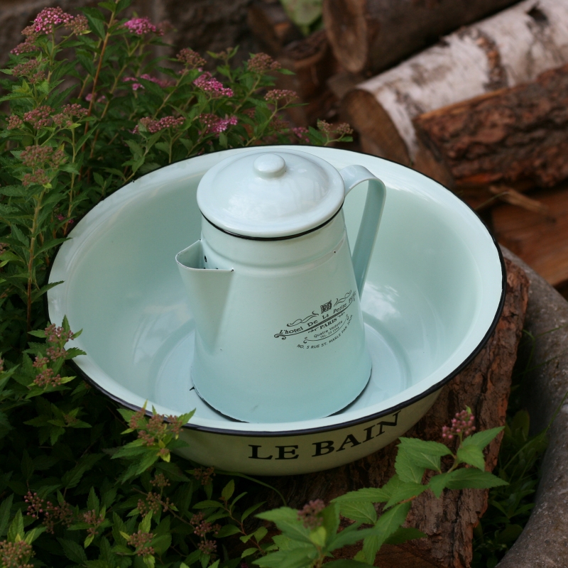 Umyvadlo je vhodné umístit na malý stolek nebo komodu a vytvořit tak mycí kout. Ať už doma, nebo na zahradě. Smaltované umyvadlo patří do nové kolekce, která kromě umyvadla obsahuje konvičku, kyblík, podnos, nočník, mýdlenku a misky.