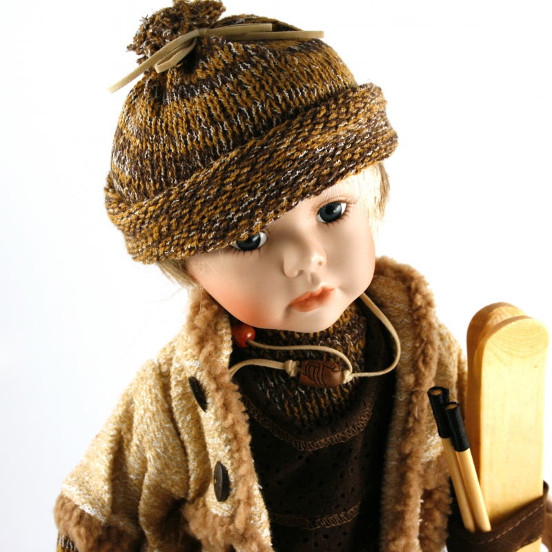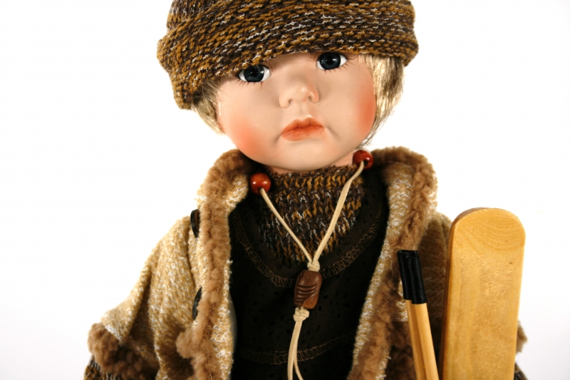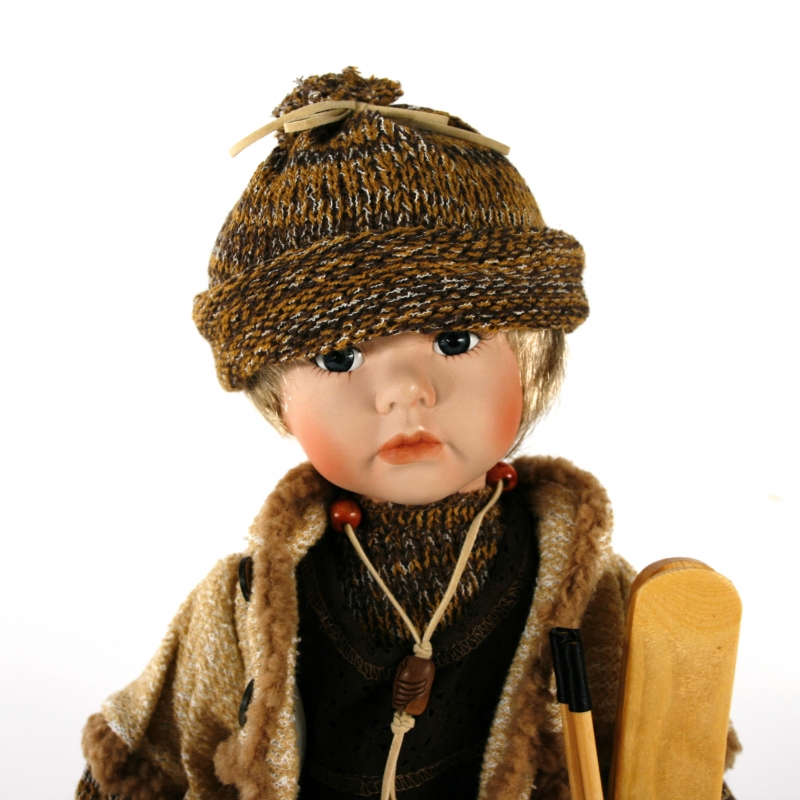 Porcelánová panenka - chlapec - na fotografii představuje sportovního kluka chystajícího se na zimní lyžovačku. Na co jiného by mu sloužily lyže, které s sebou nese?