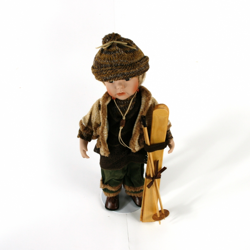 Vánoční dekorace - porcelánová panenka chlapec s lyžemi 43cm