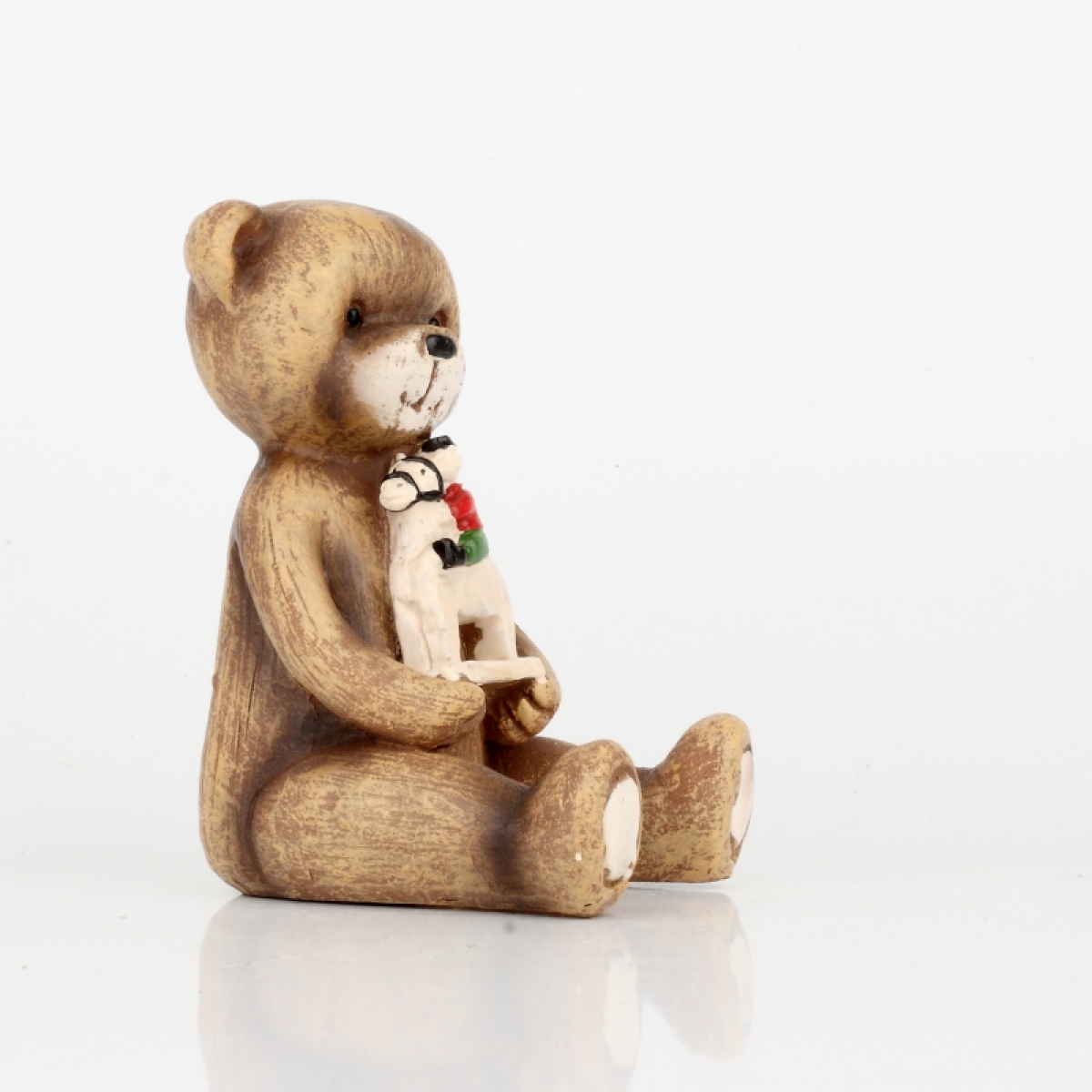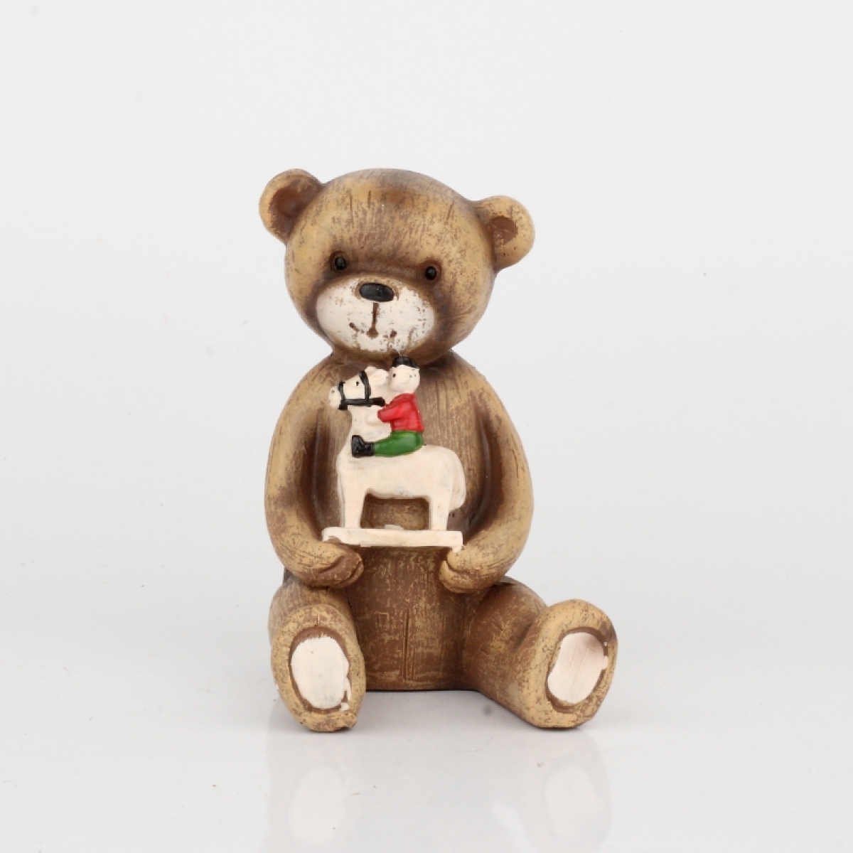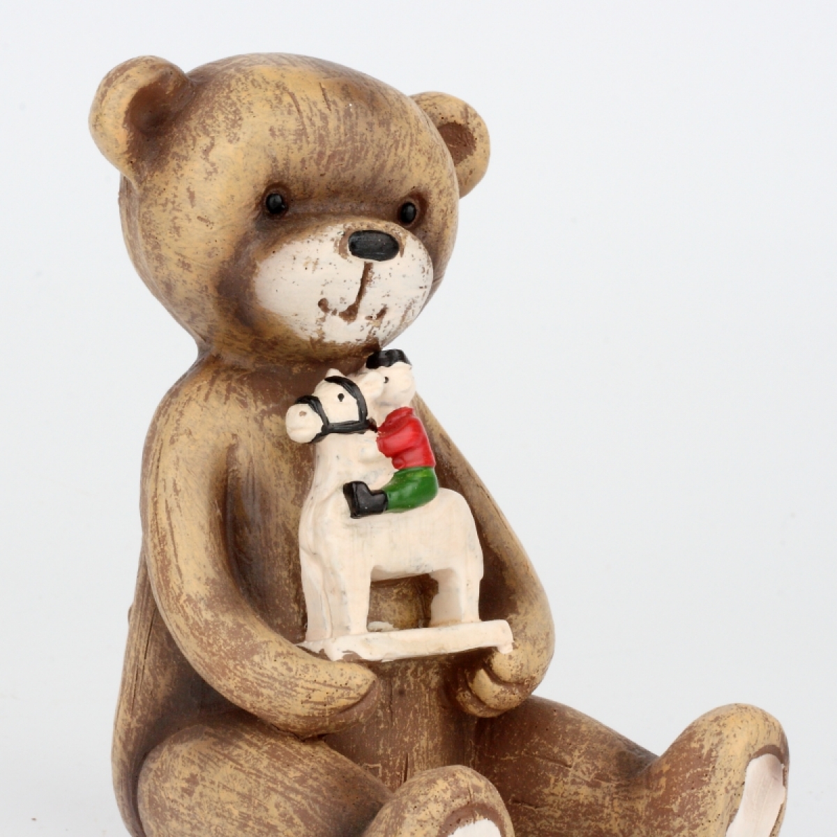 Roztomilý sedící medvídek, který drží malého koníka s postavičkou, bude hezkou dekorací nejen do dětského pokoje.