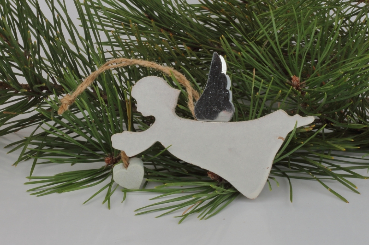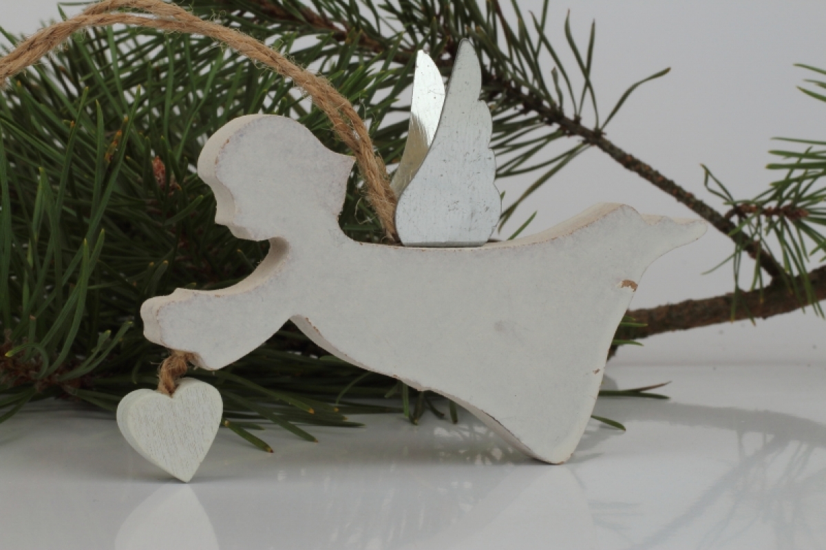Bílý závěsný andílek držící v rukou srdíčko na provázku.